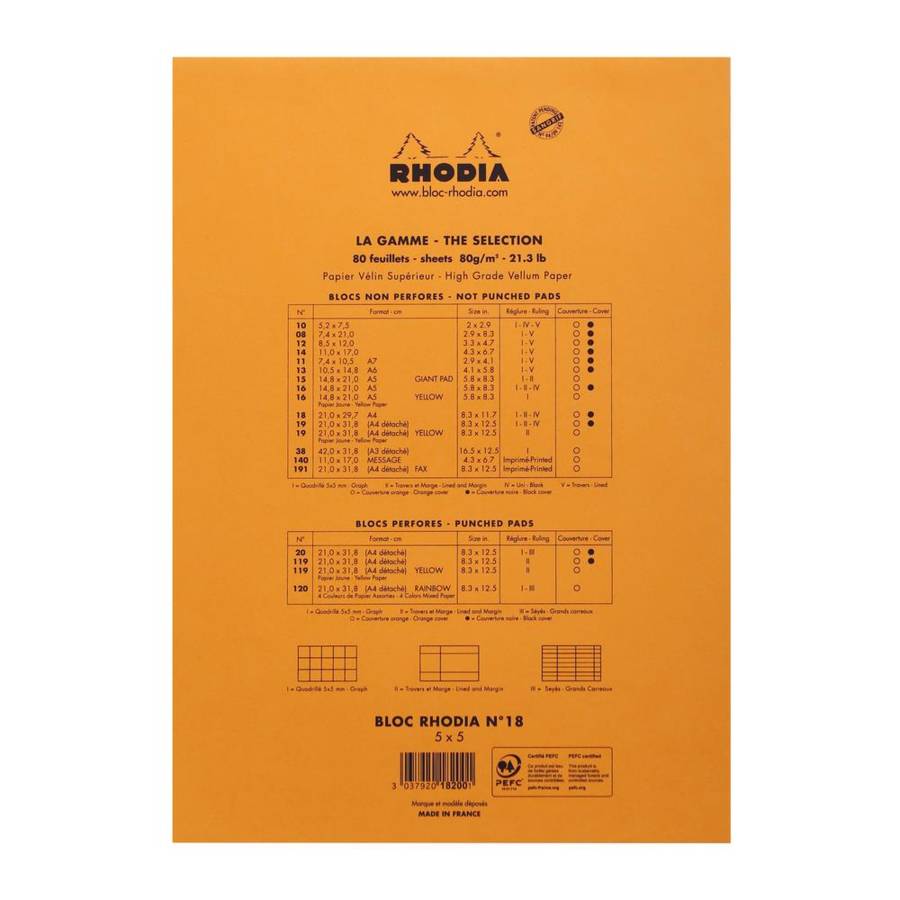 RHODIA Bloc de direction couverture orange 80 feuilles (160 pages) format A4 réglure 5x5 21 x 29,8 cm avec 80 pages et une couverture arrière rigide Le papier blanc a une finition satinée exceptionnellement lisse 80 grilles sans acide - Papier pH neutre Quadrillage violet pâle, 5 x 5 carrés par pouce Microperforé sur le dessus pour un retrait facile et propre