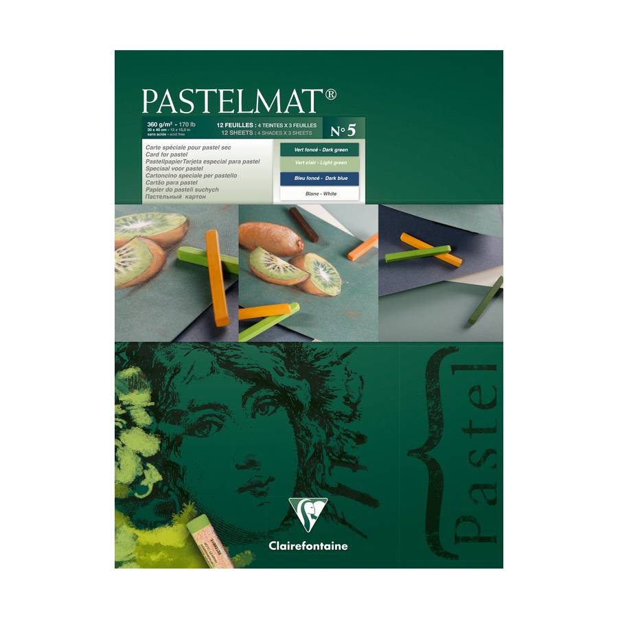 Bloc Pastelmat n°5 12 feuilles 30x40cm Carte pour le dessin au pastel sec qui retient la poudre de manière exceptionelle, permettant de multiplier les couches sans effet de saturation Limite l'usage du fixatif Peut être mouillé et gommé sans perdre ses propriétés Nouvelles couleurs en assorti ( vert clair, vert foncé, bleu foncé, blanc))