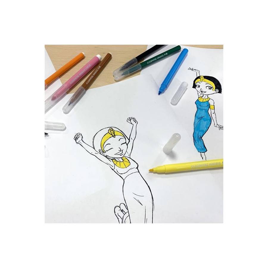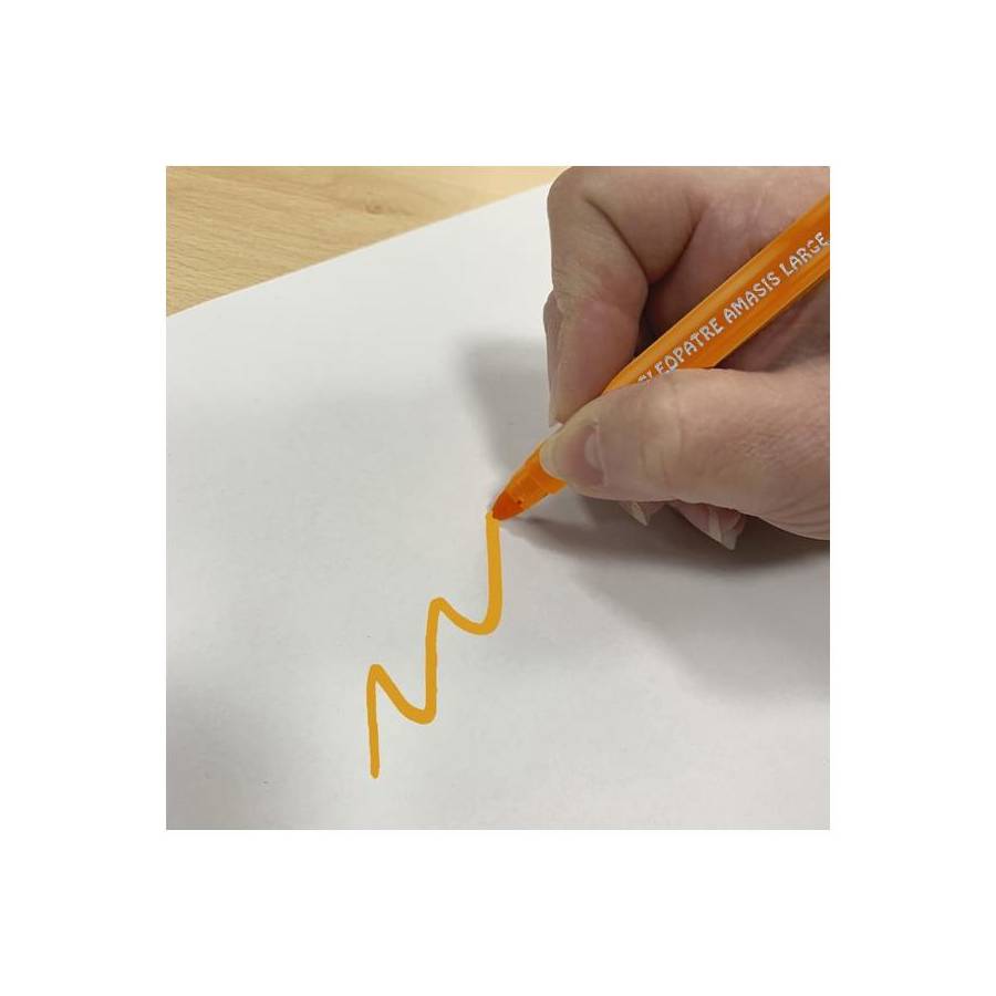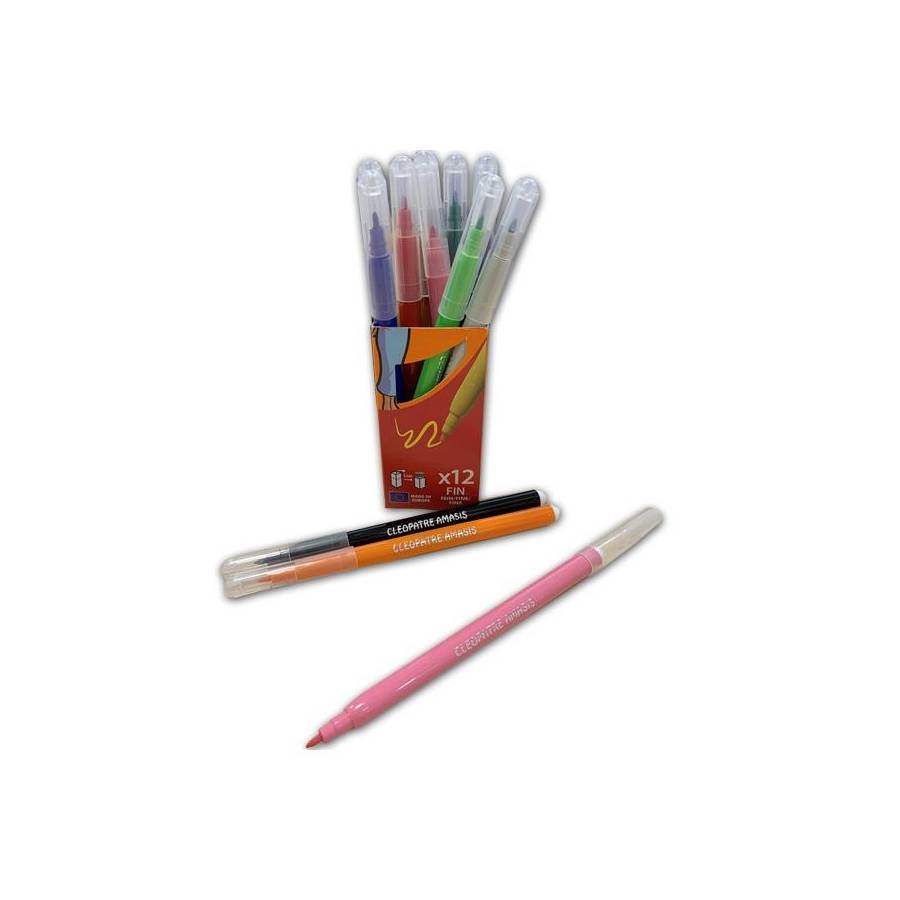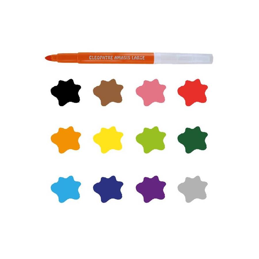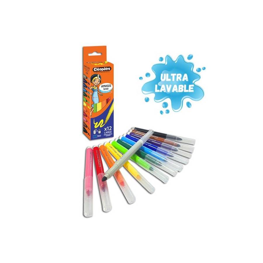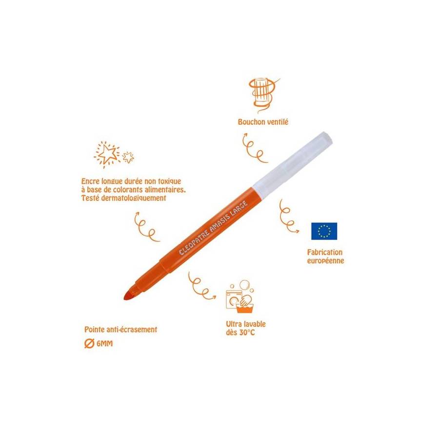 Voir plusBoîte de 12 feutres Pharaon AMASIS pointe large 6mm La qualité Cléopâtre : - Des feutres aux couleurs vives et brillantes à base d'encres non toxiques et colorants alimentaires - Ultra lavable dès 30°C sur les vêtements, se lavent également sur les mains et toutes autres surfaces. - Produits respectant la norme jouet. - Bouchon ventilé qui assure la sécurité des enfants - Pointe anti-écrasement pour une utilisation longue durée Une gamme complète pour répondre à tous les besoins ! - Une pointe fine 2mm, adaptée pour le dessin et le coloriage à partir de 9 ans - Une pointe moyenne 2,6mm, pour le dessin et le remplissage à partir de 6 ans - Une pointe large 6mm, pour le remplissage dès 3 ans Prise en main facile par les enfants. Pratique, le pack se transforme en pot à crayon ! Ils sont parfaits pour une utilisation à l'école ou à la maison. Les feutres sont issus d'une fabrication européenne.
