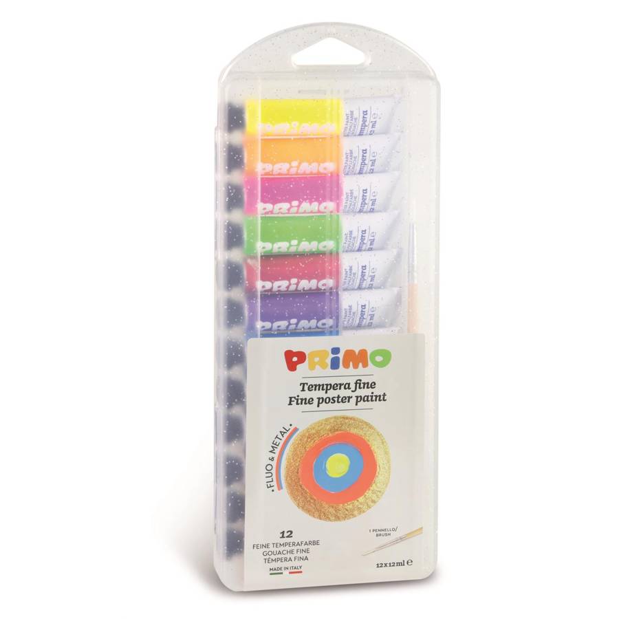 Boîte de 12 Tubes 12ml Gouache 12 couleurs: 4 couleurs fluos et 8 Métalliques