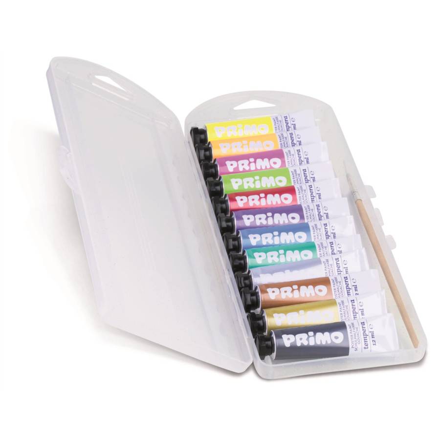 Douze jolis petits tubes avec beaucoup de gouache à presser sur ta feuille. Les couleurs ne brillent pas dans la nuit, mais elles donnent une lumière à tes travaux créatifs, communiquant joie et énergie. Avec de l'eau et un pinceau tu peux la travailler pour obtenir des nuances infinies. Ajoute une autre couleur, puis une autre et encore une autre.... Qu'est ce qu'il se passe si tu mélanges les couleurs entre elles?