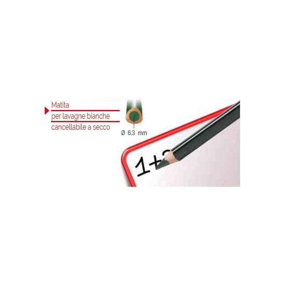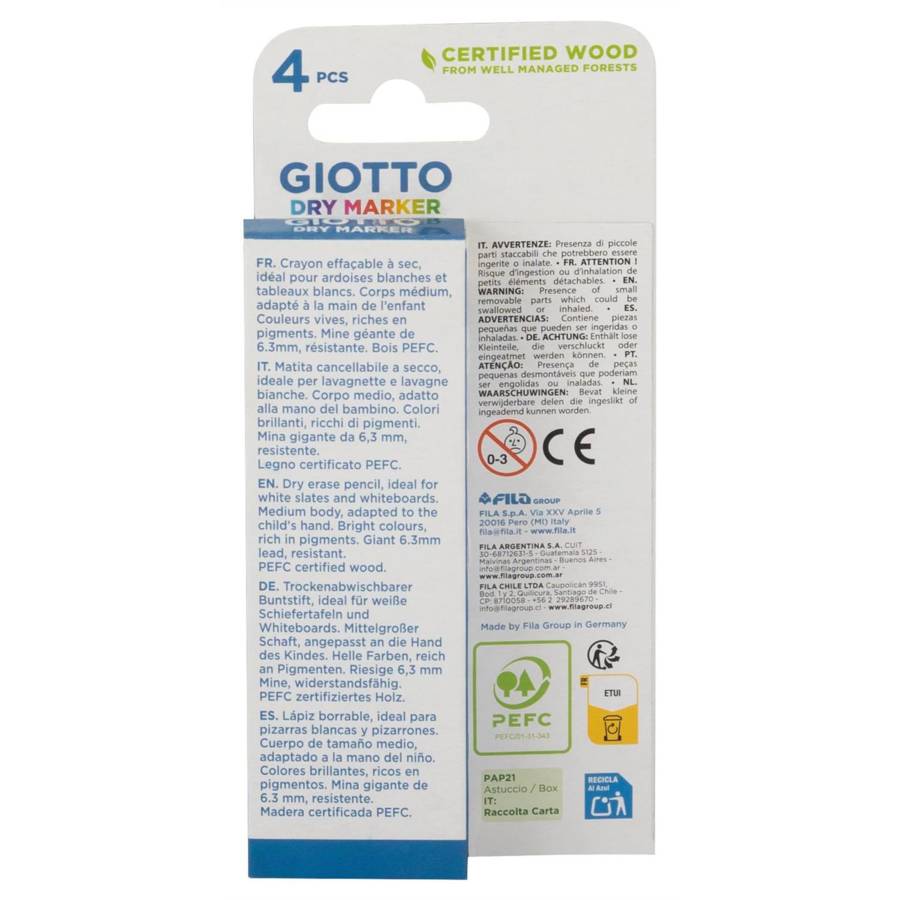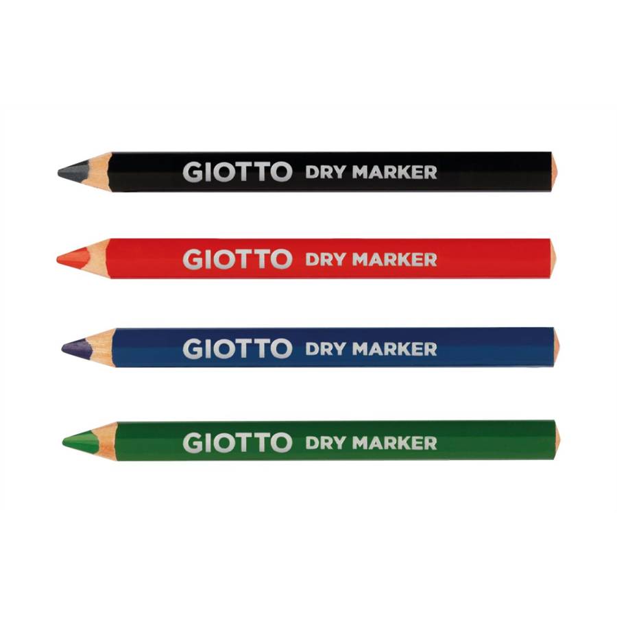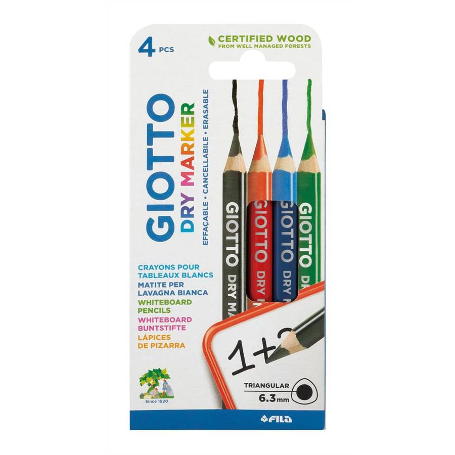 4 crayons triangulaires assortis : bleu, rouge, noir, vert Effaçables à sec sur ardoises et tableaux blancs. Ne laisse pas résidus. Couleurs vives et riches en pigments Mine géante de 6.3mm résistante. Corps médium adapté à la main de l'enfant Bois certifié PEFC