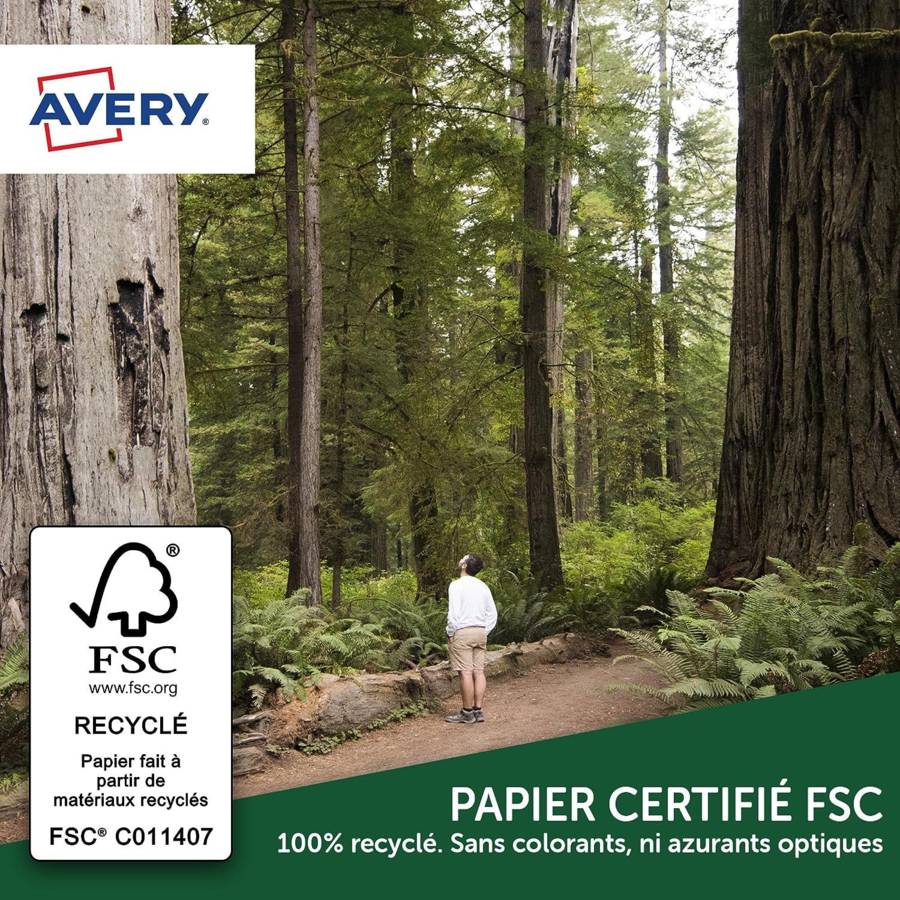 Etiquettes et support 100% recyclés Emballage recyclé, adhésif écologique à base d'eau, étiquettes fabriquées sans chlore Modèles et logiciels GRATUITS sur www.avery.fr Garanties sans bourrage - Gain de temps pour détacher vos étiquettes grâce à la technologie « Facile à décoller de la planche»