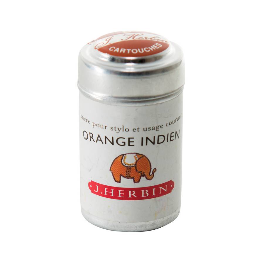 Herbin Boîte de 6 cartouches d'encre standard Orange indien Encre d'écriture de qualité exceptionnelle Riche en couleur avec une texture incomparable Idéal pour la calligraphie Peut être aquarellable, se dilue facilement avec de l'eau et s'applique au pinceau Cartouches au format universel Compatibles avec la plupart des stylos plumes et des stylos roller à encre Conditionnées dans une petit boîte en métal