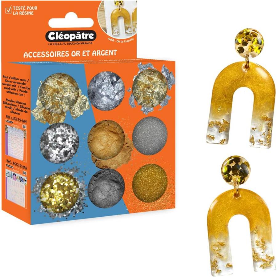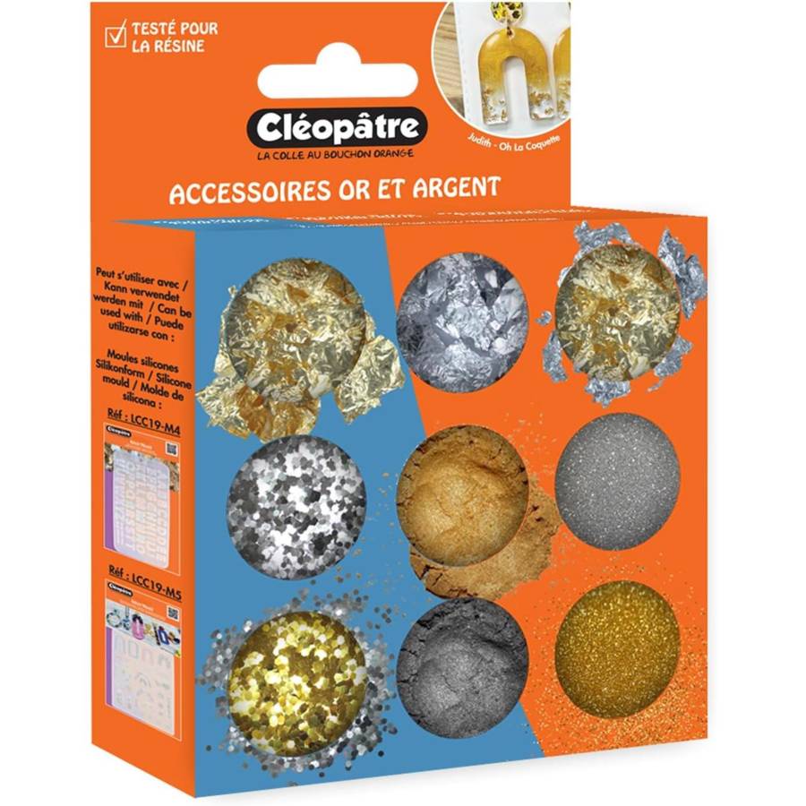 Voir plusKit d'accessoires de remplissage pour embellir vos créations en résine et ajouter une touche d'éclat à votre créativité ! Des nuances spécialement choisies par des créatrices du monde de la résine, avec 9 accessoires décoratifs or et argent, des décorations assorties aux couleurs phares, pour embellir vos créations en toutes occasions. Elles sont fines, légères et faciles à mélanger dans la résine. Les couleurs sont miscibles pour obtenir des effets subtils ou intenses selon vos préférences. Vous pouvez les couler dans des moules et créer des bijoux, des porte-clés, personnaliser votre coque de téléphone... Vous pouvez aussi les utiliser pour tout autre projet DIY. Elles peuvent s'utiliser avec toutes les résines, UV et epoxy (UV'Glass, Crystal'Diamong, Glass'Lack, Glass'Flex), et avec les moules silicone (LCC19-M1, -2, -3, -4, -5). Composé d'un assortiment de 9 pots d'accessoires décoratifs or et argent : 2g de paillettes fines or, 2g de paillettes fines argent, 1.5g de paillettes hexagonales 3mm or, 1.5g de paillettes hexagonales 3mm argent, 1g de poudre de mica or, 1g de poudre de mica argent, 2 pots de feuilles or, 1 pot de feuilles argent. Les divers accessoires or et argent sont faciles à saisir dans les pots, qui se referment avec leur bouchon à vis, pour ne pas en perdre !