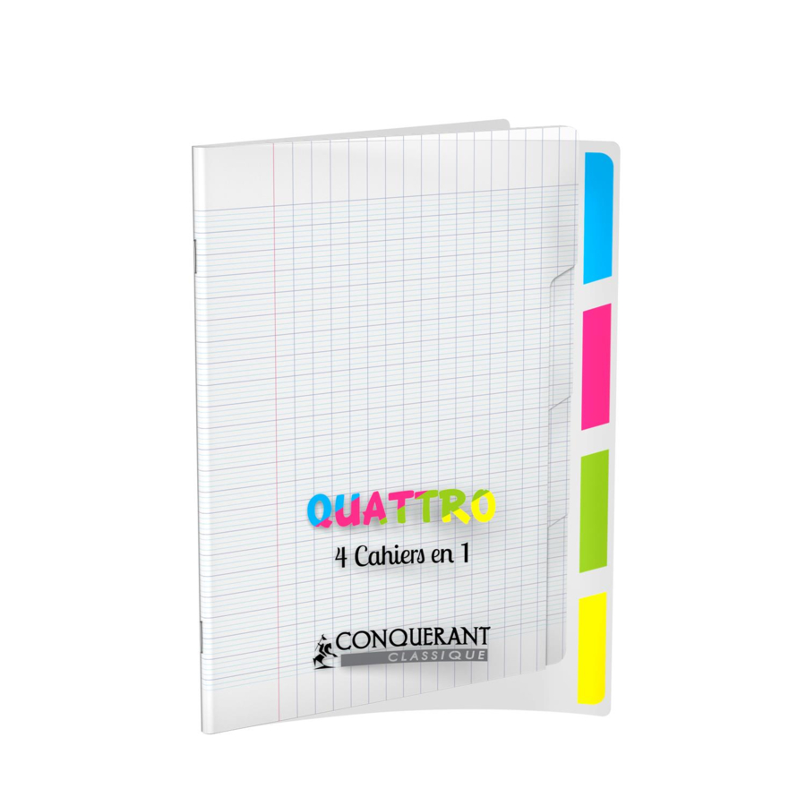 Caractéristiques du produit Format scolaire - Largeur : 17cm x Hauteur : 22cm Réglure à grands carreaux Seyès, en 2 couleurs, avec une marge à gauche 140 pages - Epaisseur 90g Couverture plastique translucide, fabriquée en polypropylène Reliure agrafée 4 onglets colorés en polypro Couleur de la couverture : Incolore Certifié Ecolabel EU ?faible impact environnemental de la fabrication du papier? et certifié PEFC™ ?gestion durable des forêts? Fabriqué en France