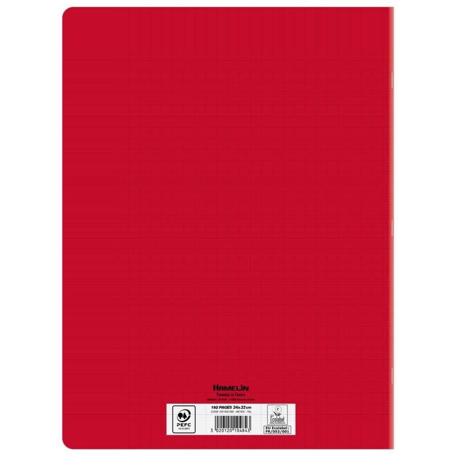 Caractéristiques du produit Format scolaire - Largeur : 24cm x Hauteur : 32cm Réglure à grands carreaux Seyès, en 2 couleurs, avec une marge à gauche 192 pages - Epaisseur 70g Couverture plastique translucide, fabriquée en polypropylène Reliure agrafée Couleur de la couverture : Rouge Certifié Ecolabel EU ?faible impact environnemental de la fabrication du papier? et certifié PEFC™ ?gestion