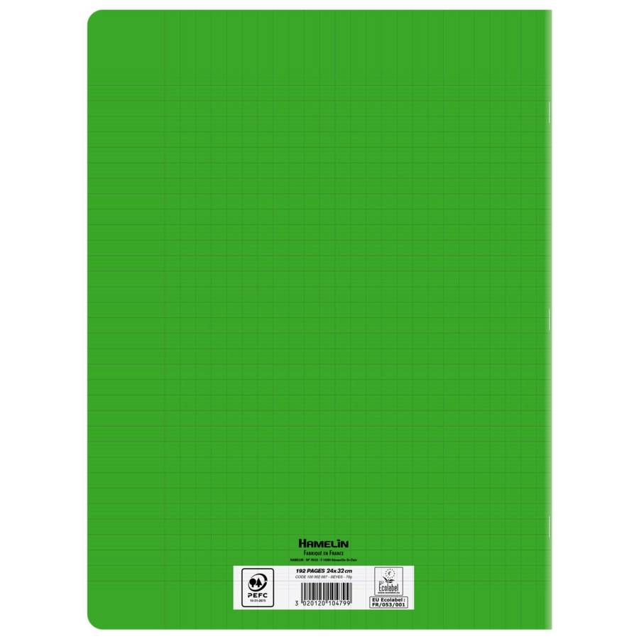 Caractéristiques du produit Format scolaire - Largeur : 24cm x Hauteur : 32cm Réglure à grands carreaux Seyès, en 2 couleurs, avec une marge à gauche 192 pages - Epaisseur 70g Couverture plastique translucide, fabriquée en polypropylène Reliure agrafée Couleur de la couverture : Vert Certifié Ecolabel EU ?faible impact environnemental de la fabrication du papier? et certifié PEFC™ ?gestion durable des forêts? Fabriqué en France