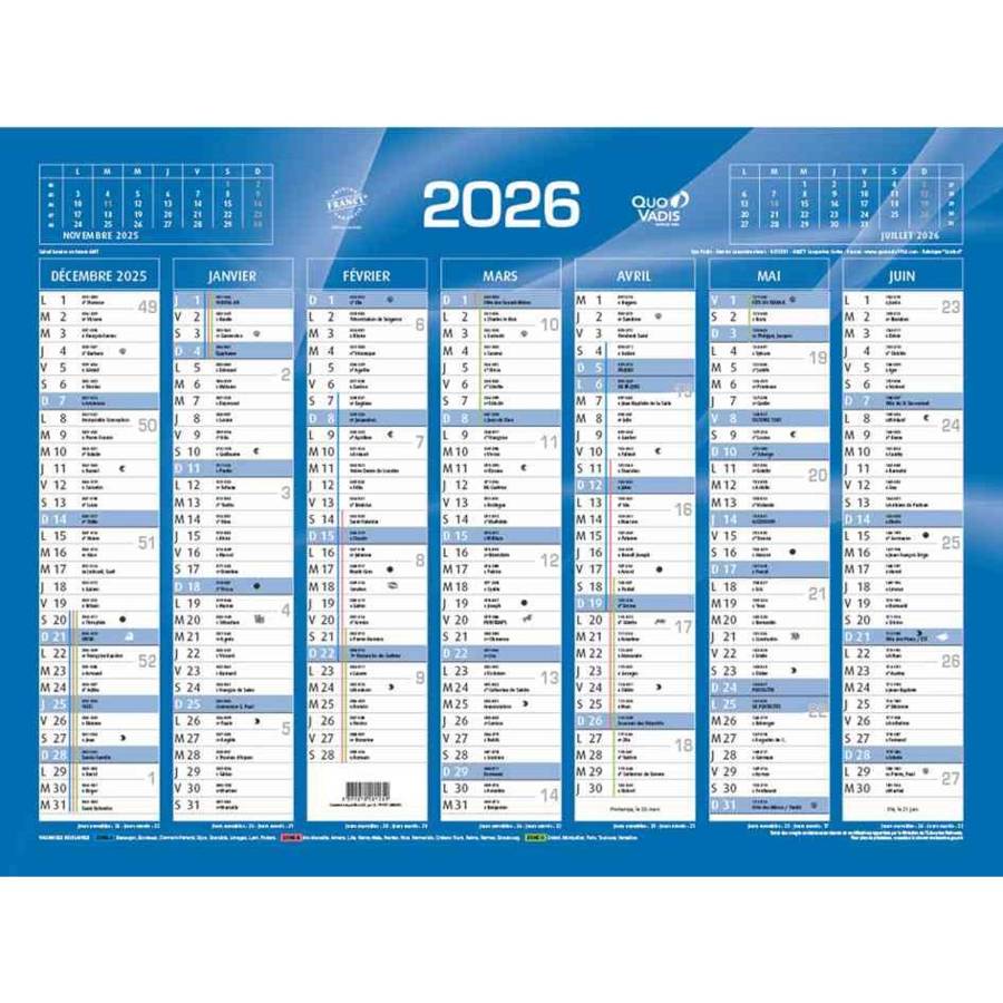 QUO VADIS Calendrier de banque bleu , 135 x 180 mm 14 mois, de Janvier à Juillet (recto) et de Juillet à Janvier (verso), imprimé quadri sur papier offset, contre- collé et rembordé, 1 oeillet de suspension (238062Q)