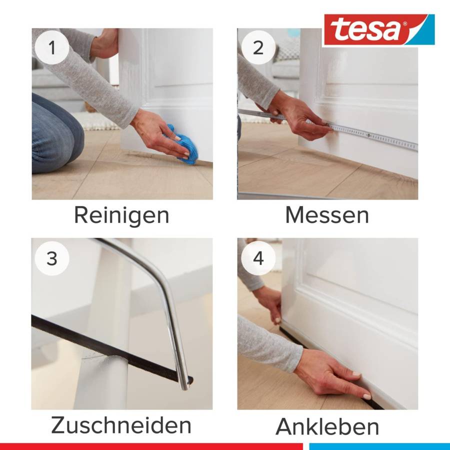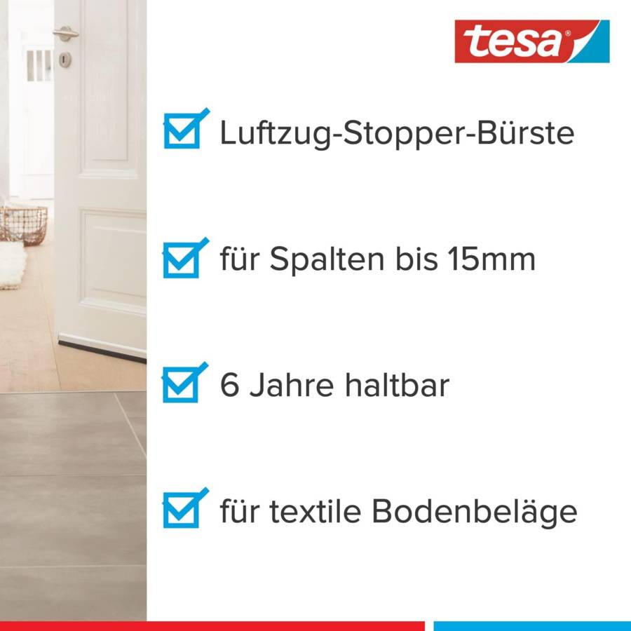 Voir plusBas de porte adhésif pour sols irréguliers : Brosse isolante à découper et coller sur le bas de porte pour une isolation thermique et phonique efficace – Convient aux espaces jusqu'à 15 mm** Installation facile : Le bas de porte isolant se découpe aux dimensions souhaitées avant de coller le rail en plastique sur le bas de la porte pour une installation rapide et durable* sans clou ni vis Action polyvalente : Le balai de bas de porte bloque les courants d'air, le froid, le bruit et la poussière – Il permet ainsi de réduire les dépenses en énergie et de faire des économies Protection optimale : La brosse à ressort à poils longs est conçue pour les sols légèrement irréguliers (tapis...) – Résistant aux UV et aux abrasifs, l'isolant pour portes a une durée de vie de 8 ans