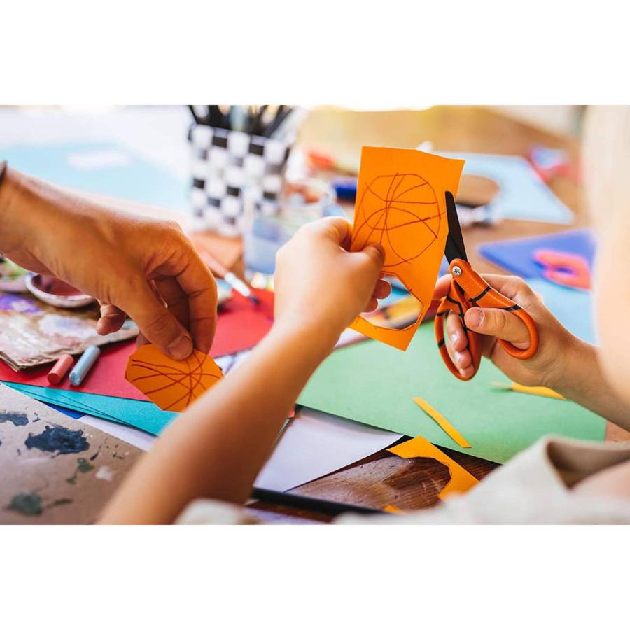 Ciseaux enfant avec imprimé ballon de basket (longueur lames: 13 cm) pour couper papier, mousse et feutrine, Pour droitiers et gauchers, À partir de 6 ans Poignées adaptées pour les enfants, Anneau conçu pour un positionnement optimal de l'index Sécurité: bouts ronds et lames épaisses au tranchant limité pour un découpage sans risque Grande longévité, Hygiénique - nettoyage facile, Design finlandais