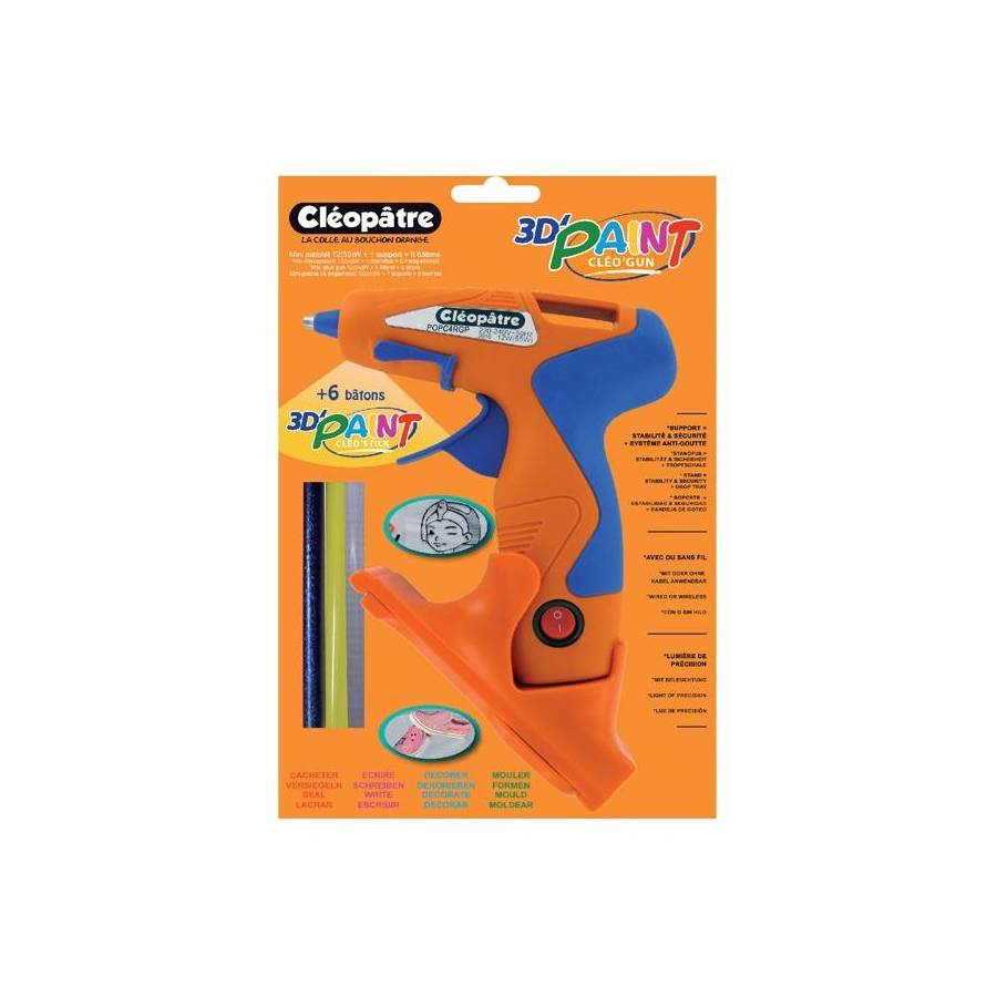 Le Cléo'GUN 3D Paint permet de réaliser des décorations en 3D. Il est composé d'un support pour plus de stabilité et d'un système anti-goutte. Il allie sécurité, confort et haute qualité grâce à un système hybride (sur prise ou sans fil) + d'une lumière de précision en mode secteur + une ergonomie améliorée avec une taille plus importante et un revêtement en silicone. Avec les bâtons de peintures colorées et pailletées, la décoration 3D est immédiate et facile à réaliser. Elle s'utilise sur une multitude de supports : tissu, bois, verre, métal, plastique... Cachetage, moulage, écriture, création et personnalisation d'objets... la seule limite est votre imagination !
