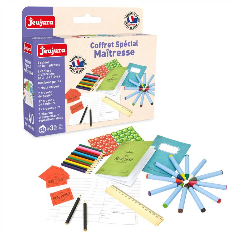 Coffret spécial maitresse : Pour s'amuser à jouer à la maîtresse et réaliser de très jolis dessins, ce coffret contient : 1 cahier de la maîtresse (avec emploi du temps et relevés de notes), 2 cahiers d'exercices pour les élèves, des bons points, une règle en bois, 2 crayons de papier, 12 crayons de couleur, 12 crayons cire, une planche d'autocollants repositionnables. 17 x 15 x 4 cm. A partir de 3 ans.