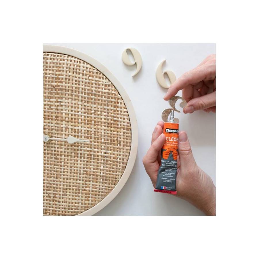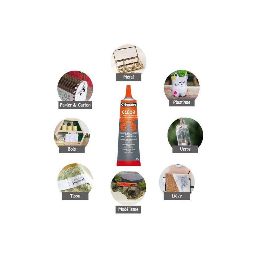 La colle Cléor est une colle contact universelle à base de solvant. Elle est adaptée pour le collage et l'assemblage de tous types de matériaux poreux et non poreux : métal, cuir, verre, plastique, porcelaine, feutrine, tissu … et même entre eux ! La puissance de collage et son élasticité lui permettent de résister à la flexion, et la destinent aussi bien à des réparations complexes qu'à des montages créatifs. La Cléor va en effet conserver la souplesse des matériaux. ...