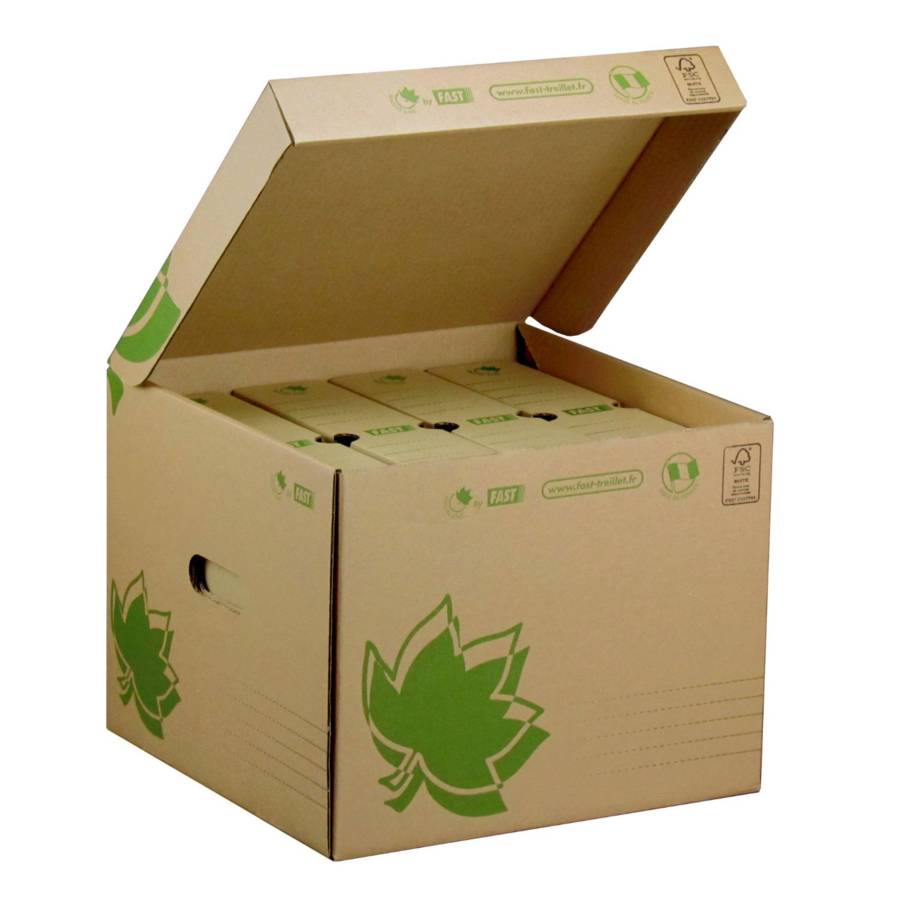 Fast - Conteneur archive ouverture sur le dessus et 4 boîtes archives dos 8cm, en kraft brun. Recyclable.
