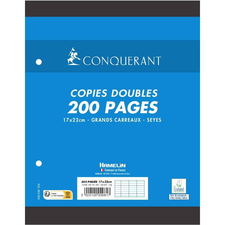 Caractéristiques du produit Format scolaire - Largeur : 17cm x Hauteur : 22cm Réglure à grands carreaux Seyès, en 2 couleurs, avec une marge à gauche 200 pages - Epaisseur 70g Les feuilles sont perforées à 2 trous Les feuilles sont conditionnées sous film Couleur des copies doubles : Blanc. Couleur de la page de garde du sachet : Bleu Certifié Ecolabel EU ?faible impact environnemental de la fabrication du papier? Fabriqué en France