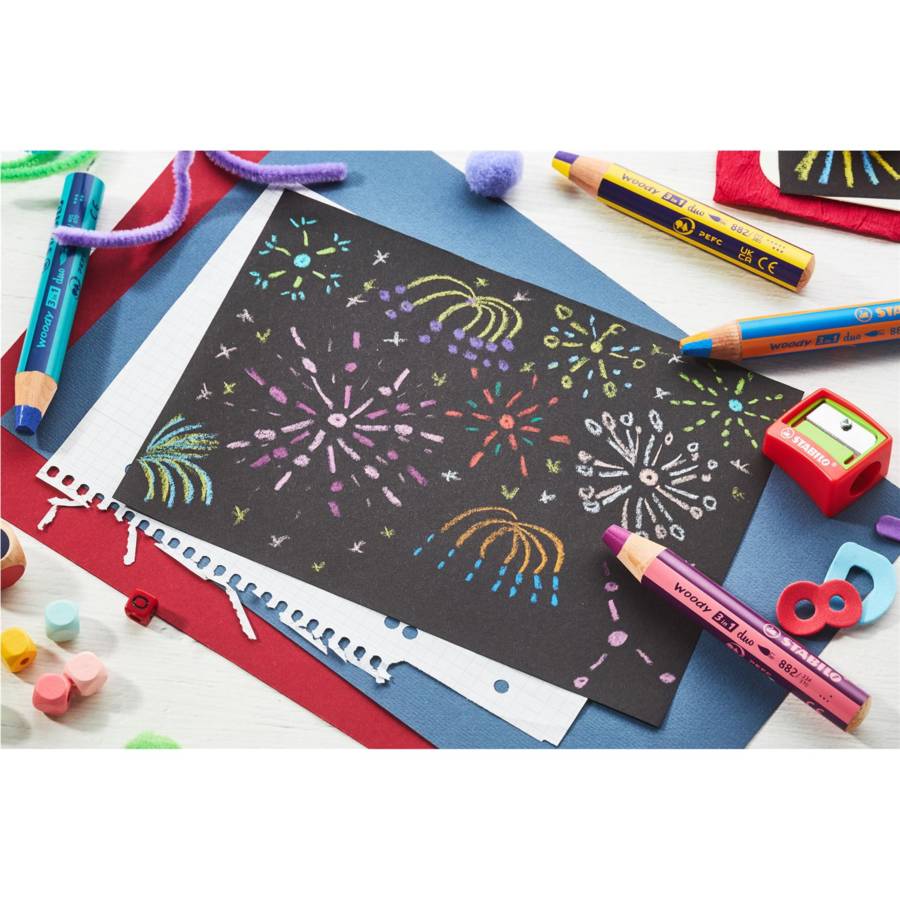 Fabriqué à 100% en bois certifié PEFC issu de forêts gérées durablement, STABILO woody 3 in 1 duo est un crayon multi-talents à la mine bicolore. En tournant simplement le crayon, ses 10 combinaisons de 2 couleurs permettent d'expérimenter de nouveaux effets colorés et stimulent la créativité des enfants. Il peut s'utiliser comme une craie grasse, un crayon de couleur, et il est également aquarellable. Il peut s'utiliser sur le carton et le papier - notamment noir ou foncé -, et sur les surfaces lisses non poreuses comme le verre, le métal ou la céramique, il s'efface d'un simple coup de chiffon humide. Les possibilités créatives sont presque infinies : les couleurs sont aquarellables et misibles avec de l'eau, la couleur peut également s'étaler ou se mélanger avec les doigts. Avec un corps court et large et une mine XXL de 10 mm ultra solide, il est idéalement conçu pour les petits artistes en herbe.
