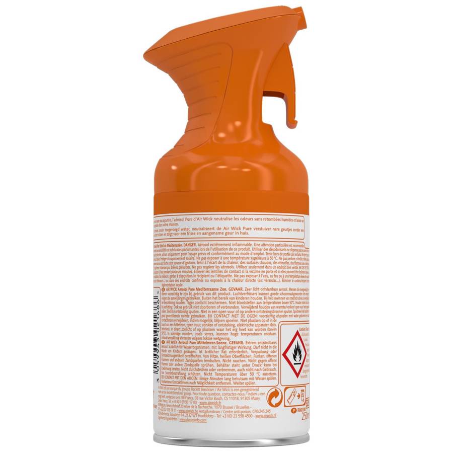 Aérosol premium sans retombées humides Parfum soleil de méditerranée Avec sa nouvelle formule sans eau, l'aérosol pure d'Air Wick élimine les odeurs sans retombées humides et laisse un parfum frais et agréable dans votre maison Découvrez Air Wick pure, profitez de tout le plaisir du parfum ! Si vous rencontrez un problème qualité ou médical lors de l'utilisation du produit, veuillez prendre contact avec le service client de RB France : Europe.ConsumerRelations@rb.com