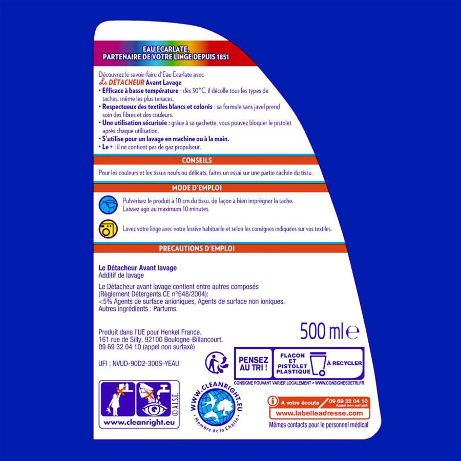 Voir plusDécouvrez le savoir-faire d'Eau Ecarlate avec Le Détacheur Avant Lavage. Efficace à basse température : dès 30°C, il décolle tous les types de taches, même les plus tenaces. Respectueux des textiles blancs et colorés : sa formule sans javel prend soin des fibres et des couleurs. Une utilisation sécurisée : grâce à sa gâchette, vous pouvez bloquer le pistolet après chaque utilisation. S'utilise pour un lavage en machine ou à la main. Le + : Il ne contient pas de gaz propulseur