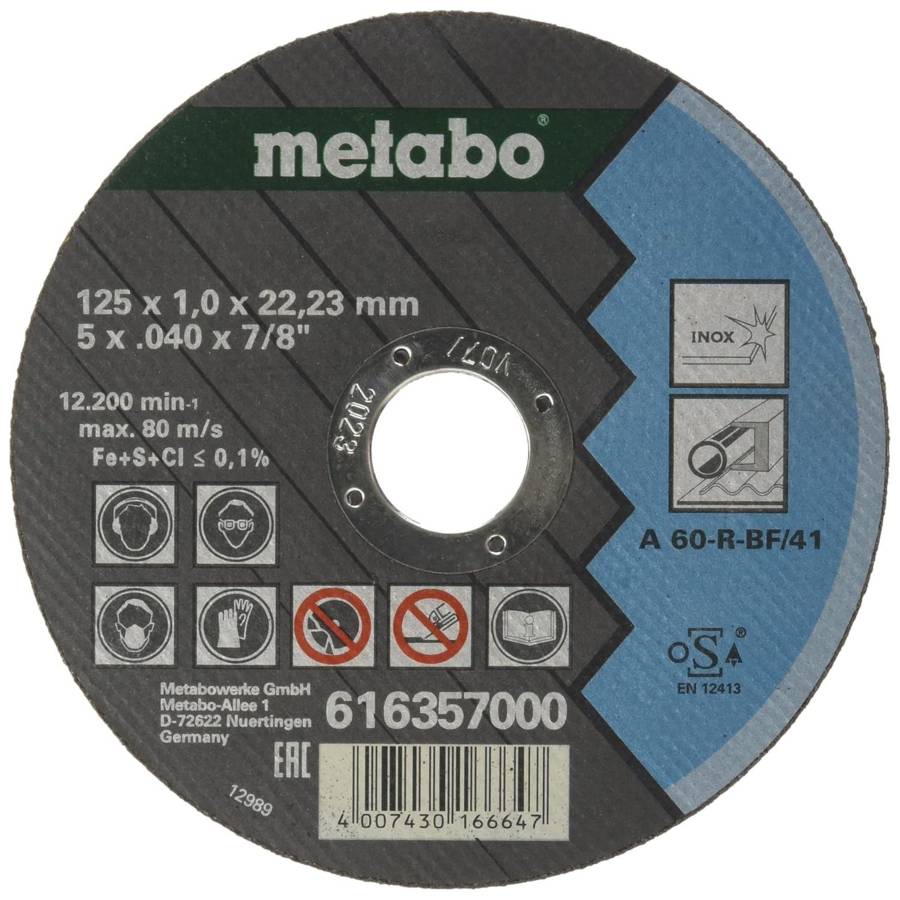 Sans fer, ni soufre, ni chlore (Fe + S + Cl = 0,1 %) Bonne capacité de coupe et bonne longévité Meule universelle pour le travail des aciers inoxydables. Sans fer, ni soufre, ni chlore (Fe + S + Cl = 0,1 %) Bonne capacité de coupe et bonne longévité Faible consommation de matériel, travail peu fatiguant, sollicitation réduite de la machine Classe de qualité A 60 R Diamètre x épaisseur x alésage 125 x 1 x 22.23 mm Modèle droit Vitesse de rotation max. 13200 /min