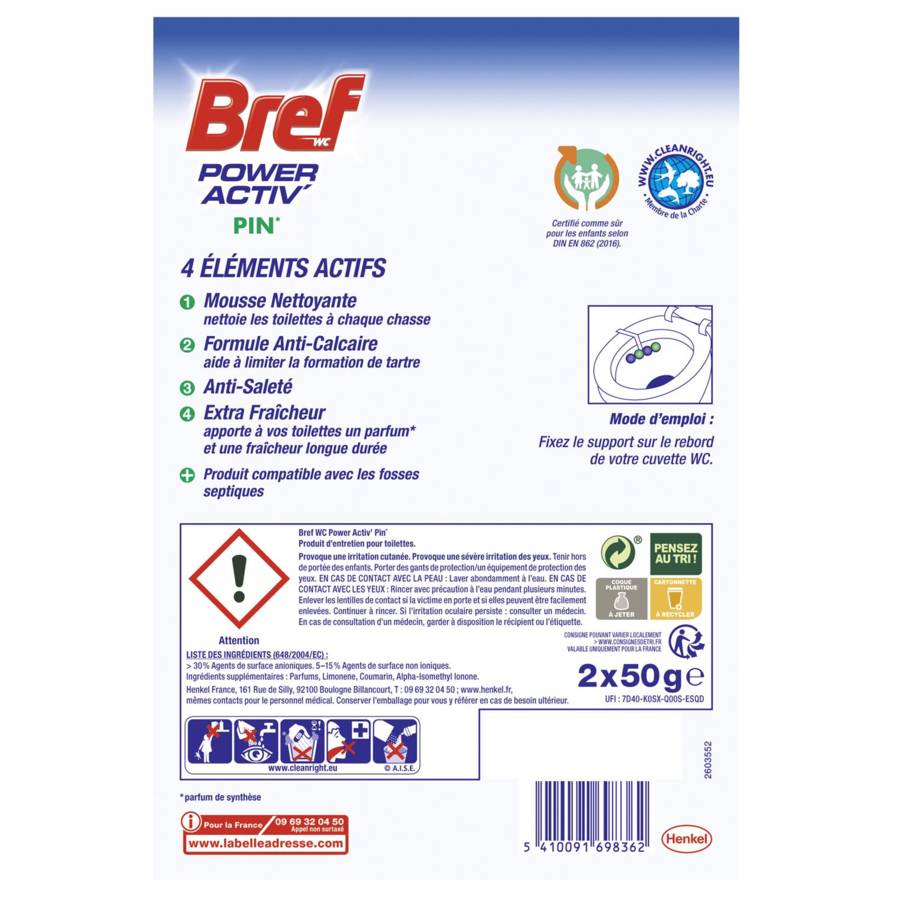 Avec sa formule unique aux 4 éléments actifs, Bref WC Power Activ' empêche le dépôt de calcaire, apporte une mousse nettoyante, une protection anti-saleté ainsi qu'une fraîcheur renforcée pour les toilettes
