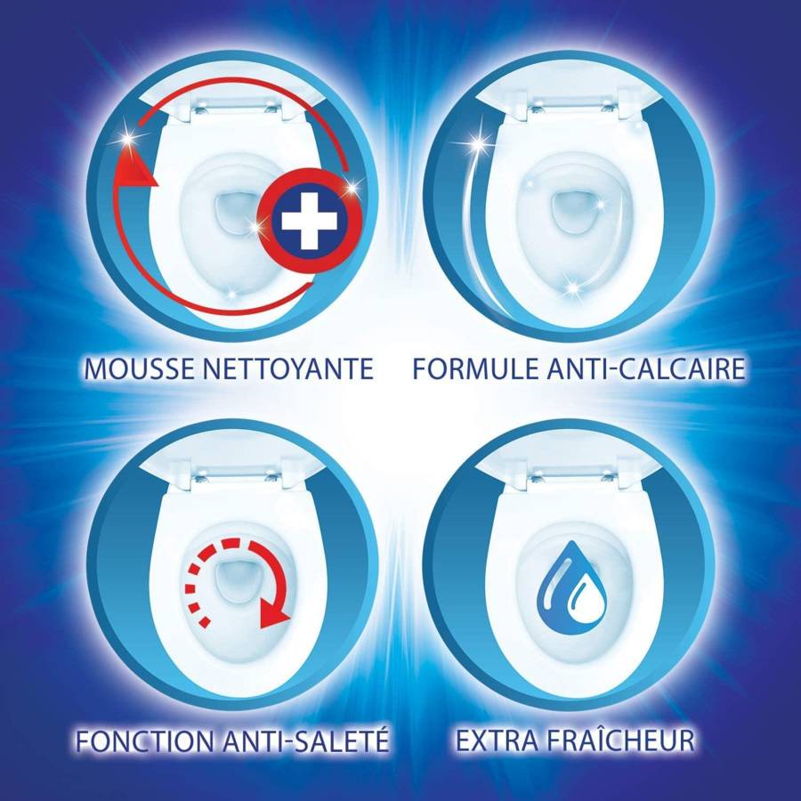 Formule anti-calcaire : aide à limiter la formation du tartre. Fonction Anti-saleté : retarde la réapparition de la saleté. Extra-fraîcheur : apporte aux toilettes une fraîcheur longue durée.