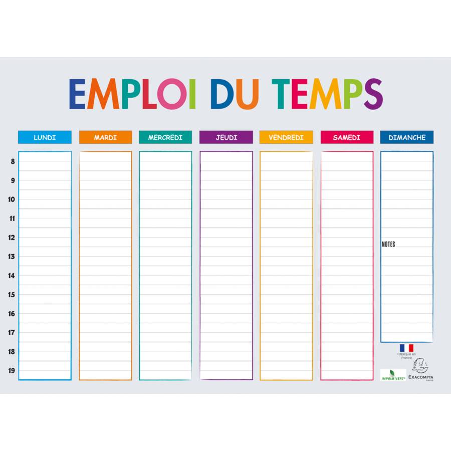 Emploi du temps Multicolore 29,5x22 cm Une colonne par jour (samedi et dimanche compris) Espace note présent dans la colonne du dimanche Indication des horaires allant de 8h à 19h Un look classique avec une touche colorée.