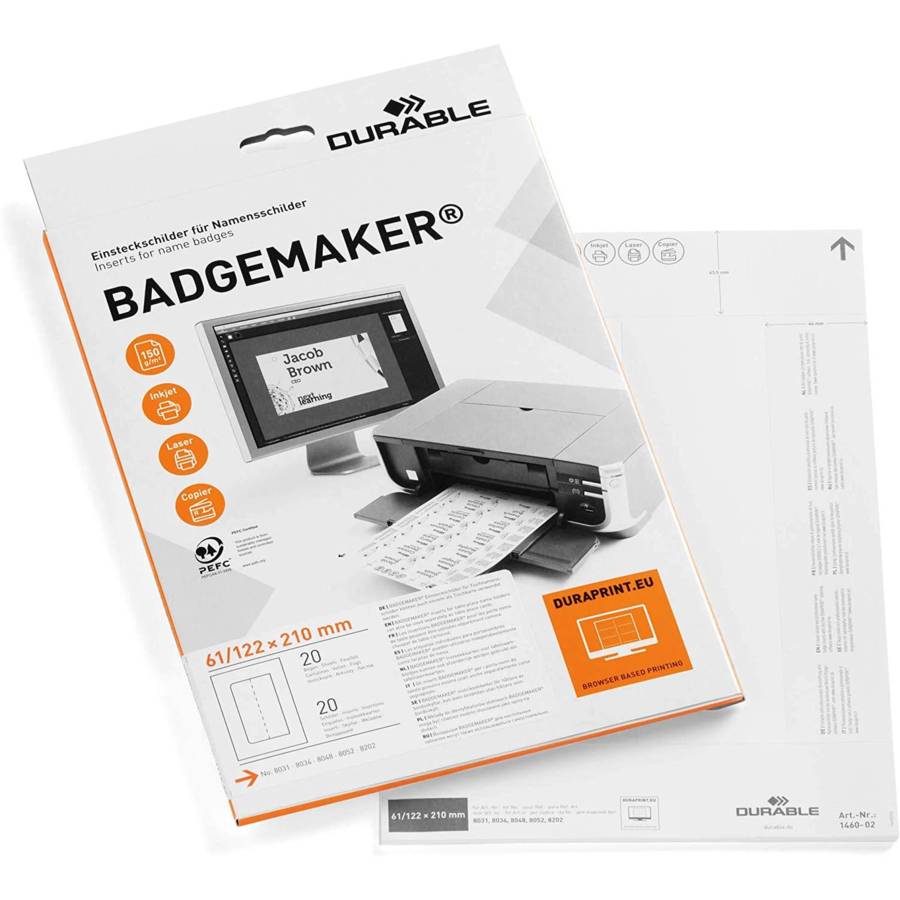 Etiquettes insérées micro-perforées BADGEMAKER sur feuilles d'impression DIN A4 Etiquetage facile avec le logiciel en ligne DURAPRINT | imprimable avec des imprimantes laser et à jet d'encre 20 étiquettes au format 61/122 x 210 mm A utiliser comme carte de table ou comme insert dans les présentoirs de table DURABLE assortis Art 8031, 8034, 8048, 8052, 8202, 8271 Respectueux de l'environnement, conformément à la norme ISO 14021 : 100 % recyclable