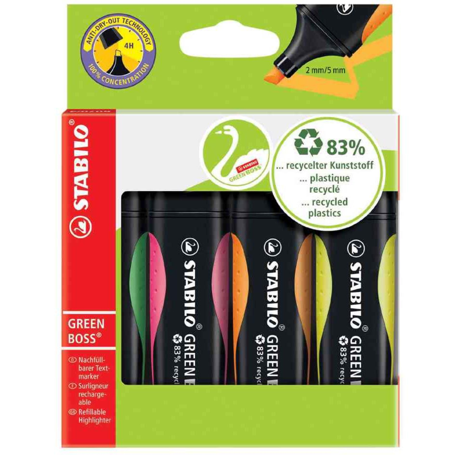 STABILO Étui carton de 4 Surligneurs GREEN BOSS Pointe Biseautée 2-5 mm - couleurs assorties