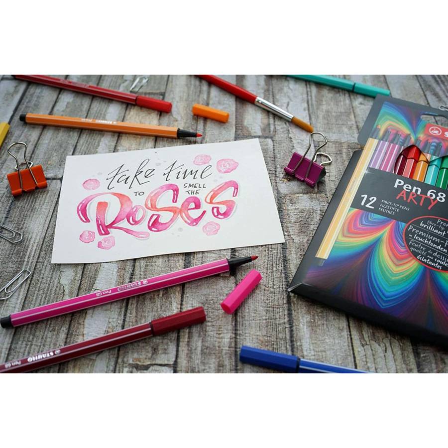 Etui carton x 30 feutres de dessin STABILO Pen 68 ARTY STABILO pen 68 est un feutre de très haute qualité pour le dessin et le coloriage Encre riche en pigments qui offre des couleurs éclatantes. Encre base d'eau, parfaitement inodore Pointe ogive de taille moyenne (tracé 1mm) pour écrire, tracer, colorier des petites surfaces ou des grands applats de couleur Le feutre STABILO pen 68 peut rester ouvert jusqu'à 24h sans sécher Etui de 30 feutres STABILO pen 68 avec décor ARTY