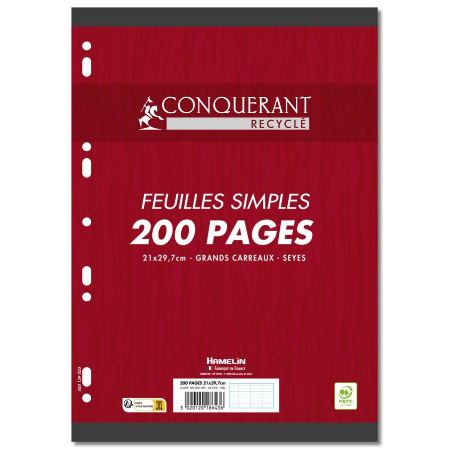 Caractéristiques du produit Format A4 - Largeur : 21cm x Hauteur : 29,7cm Réglure à grands carreaux Seyès, en 2 couleurs, avec une marge à gauche 200 pages - Epaisseur 90g Les feuilles sont perforées à 9 trous Les feuilles sont conditionnées sous film Couleur des feuilles simples : Blanc. Couleur de la page de garde du sachet : Rouge Fabriqué en France