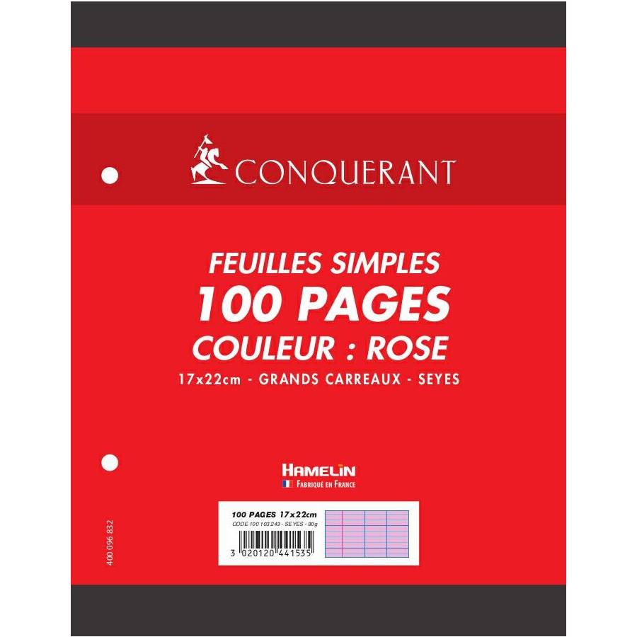 Caractéristiques du produit Format scolaire - Largeur : 17cm x Hauteur : 22cm Réglure à grands carreaux Seyès, en 2 couleurs, avec une marge à gauche 100 pages - Epaisseur 80g Les feuilles sont perforées à 2 trous Les feuilles sont conditionnées sous film Couleur des feuilles simples : Rose. Couleur de la page de garde du sachet : Rouge Certifié Ecolabel EU ?faible impact environnemental de la fabrication du papier? Fabriqué en France