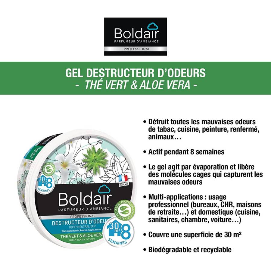 Voir plusPARFUM THÉ VERT & ALOE VERA Le Gel Boldair Thé Vert & Aloe Vera diffuse agréablement un parfum frais et vivifiant dans tous types de pièces en agissant par évaporation de manière continue. Grâce à sa grille de diffusion, le gel s'évapore de façon régulière ayant ainsi une efficacité permanente et durable. Sa formule composée d'agents actifs naturels entre en contact avec les molécules malodorantes dans l'air et les détruit. Surfaces adaptées : Le Gel Boldair est efficace sur toutes les mauvaises odeurs : tabac, cuisine, poubelles, toilettes, moisissures, renfermé, animaux, peinture… Il s'utilise partout où les odeurs persistent : maison, voiture, bureau, vestiaires, collectivités…