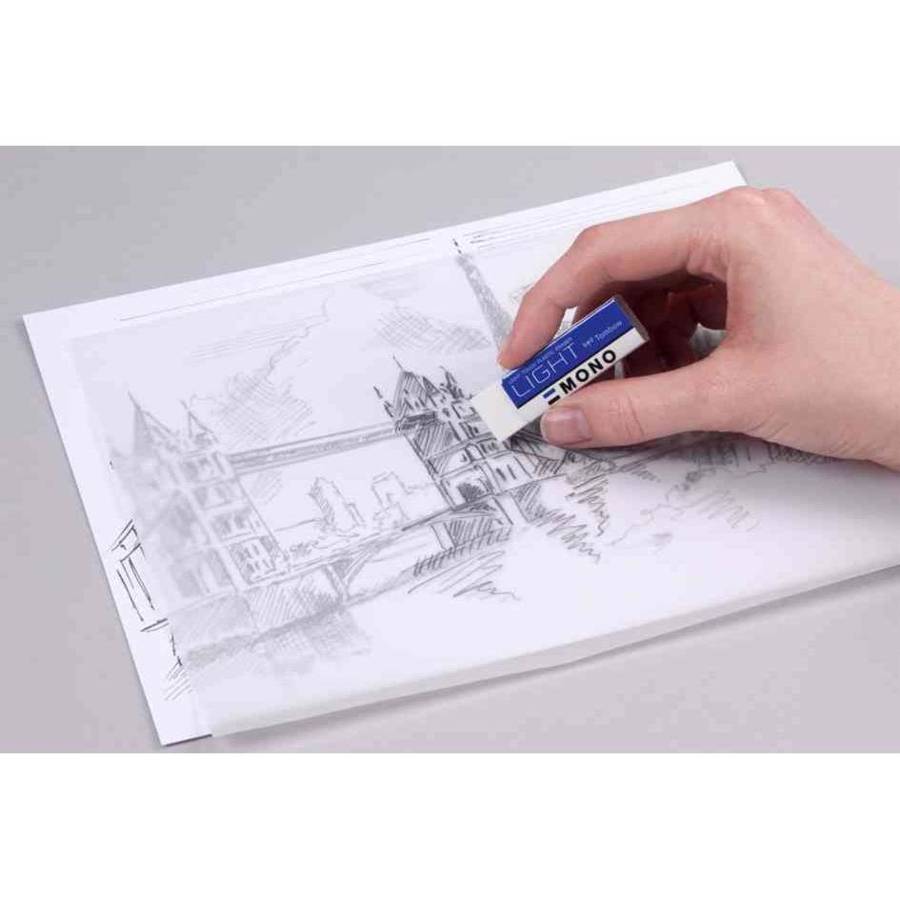 La gomme MONO Light permet un effacement particulièrement doux avec d'excellents résultats. En raison de sa consistance solide, la gomme colle moins au papier que les gommes standards. Par conséquent, elle peut être utilisée même avec une faible pression et convient parfaitement pour les papiers délicats. Un étui de papier cartonné protège la gomme de la saleté. Les coins de l'étui sont biseautés afin de ne pas couper la gomme durant une forte pression lors de l'utilisation. Matériaux: PVC, sans phtalates et sans latex. Poids: 13 g. La gomme est recommandée par BD-Monde: https://www.youtube.com/watch?v=HZm9gd7v7g8