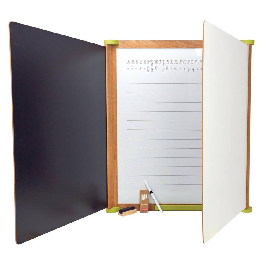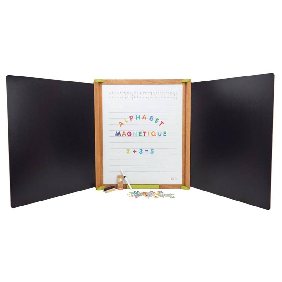 Voir plusINCONTOURNABLE : Grand classique des jeux d'imitation, découvrez le grand tableau triptyque en bois teinté de lar marque Jeujura EVEIL : Ce tableau en bois permettra aux enfants d'exprimer leurs talents et de s'amuser à écrire et à dessiner comme à l'école APPRENDRE : Comme à l'ecole, ces tableaux multifonctionnel pourront aider à votre enfant de dévolopper ses talents COFFRET : Le tableau est composé de 3 volets en bois, une ardoise centrale magnétique sérigrapgie, deux volets avec une face craie et une face pour feutre effaçable à sec. Il est aussi fourni une boîte de 3 craies, feutre effaçable à sec, brosse à tableau,76 caractères aimantés : lettres, chiffres et signes IDÉE CADEAU : Jouet Fabriqué en France. Idéal dès 3 ans, petits et grands pourront s'amuser à dessiner et a écrire
