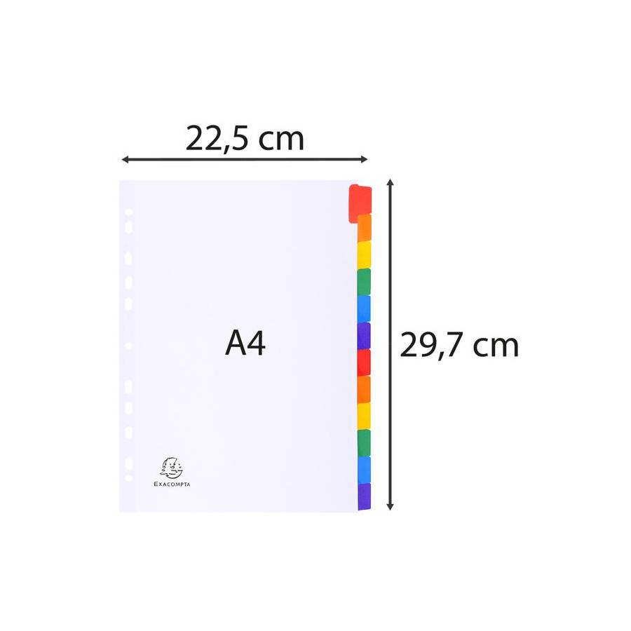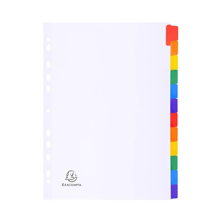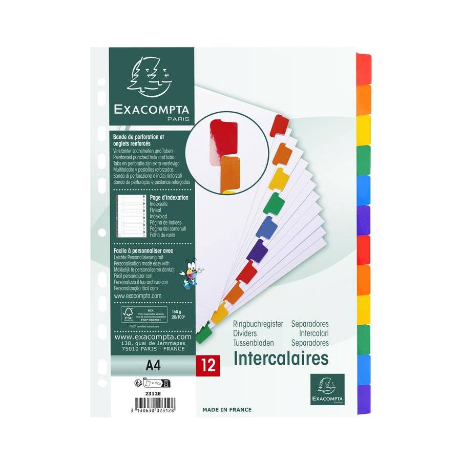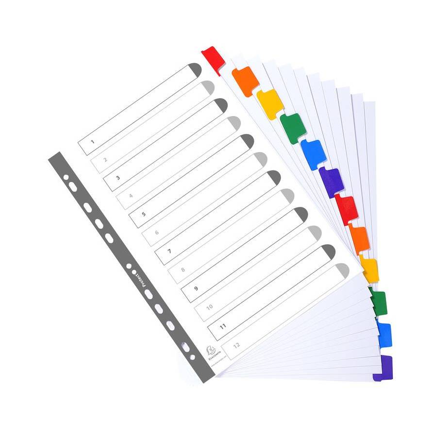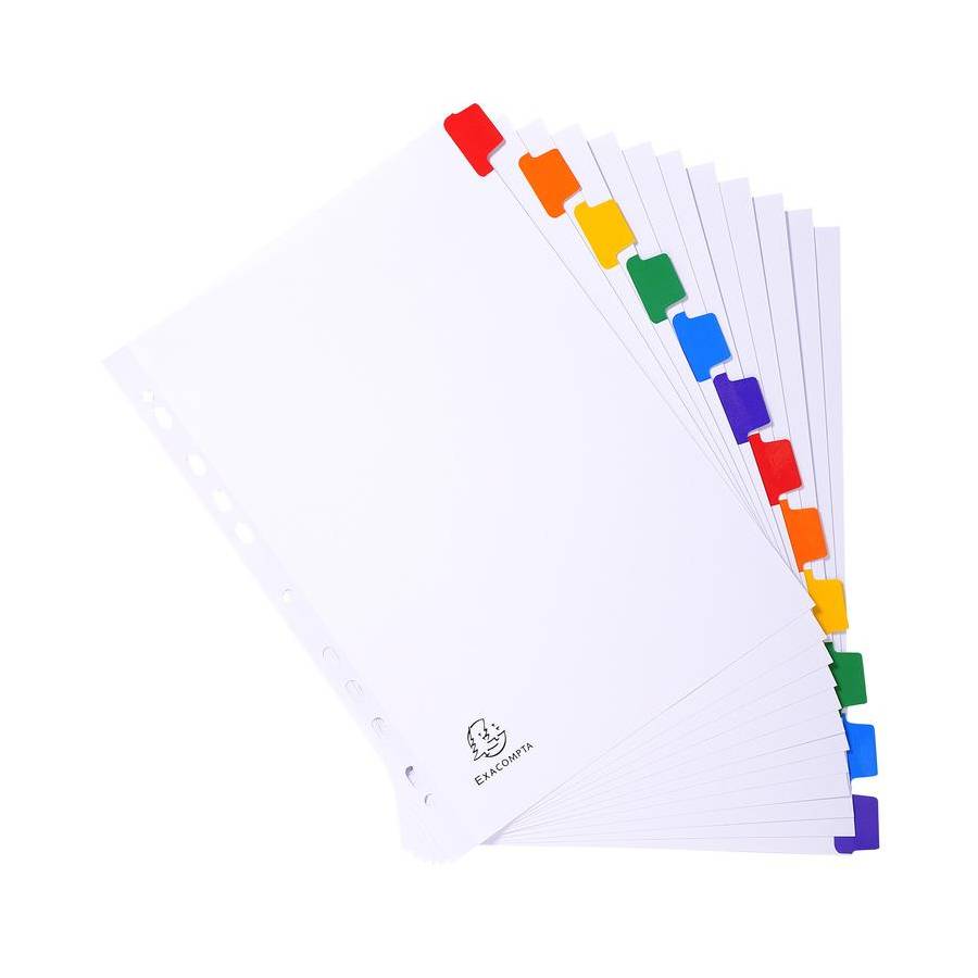 Intercalaires carte blanche 160g avec onglets couleurs renforcés - 12 positions - A4 Page d'indexation renforcée et imprimable gratuitement avec Kreaman® sur www.exacompta.com Perforations et touches multicolores renforcées.