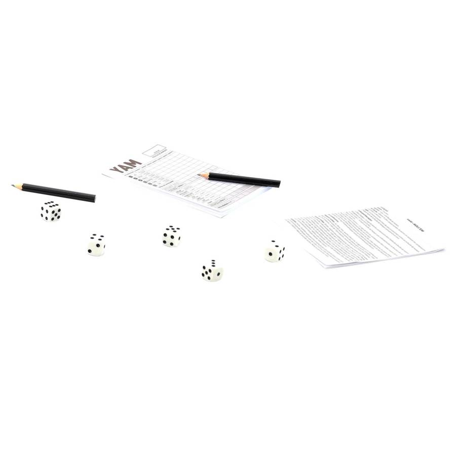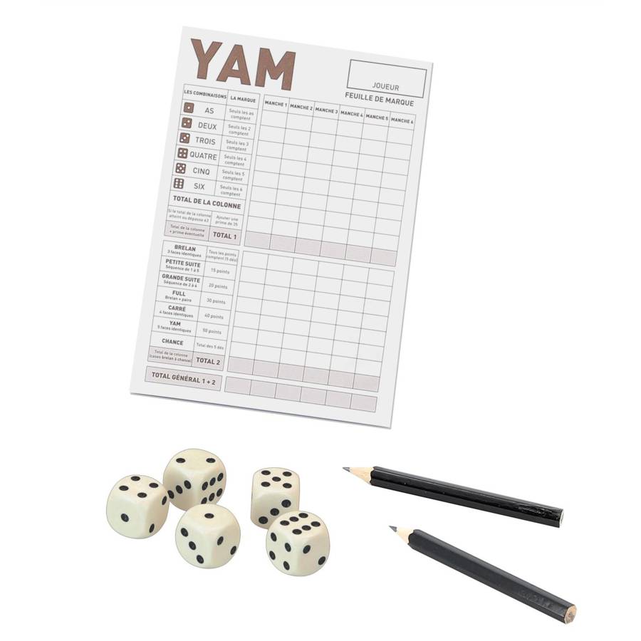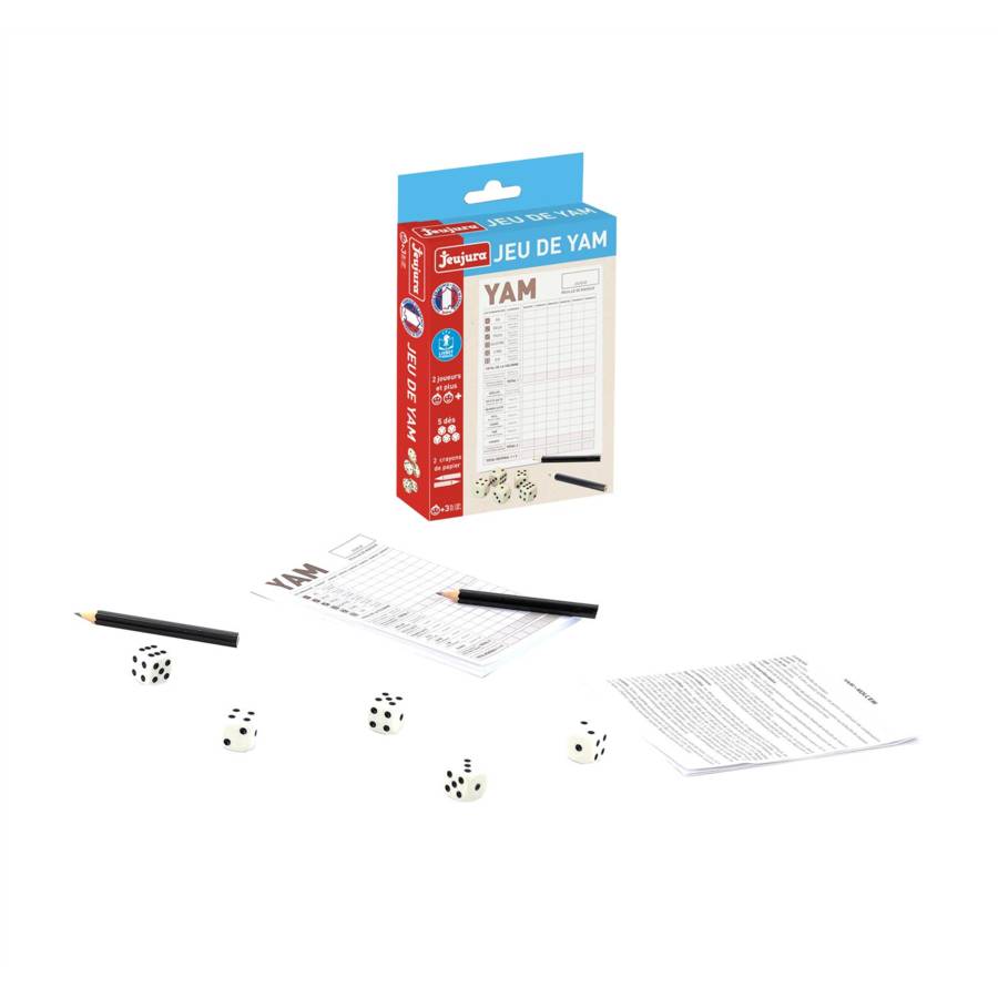 Le jeu de Yam est un jeu de hasard raisonné. Il faut réaliser, avec les 5 dés, des combinaisons afin de marquer le plus de points. Jeu de Yam : 5 dés de 16 mm, 1 bloc de Yam, 2 crayons de papier, règle du jeu - coffret carton : 11 x 17 x 3 cm - A partir de 3 ans