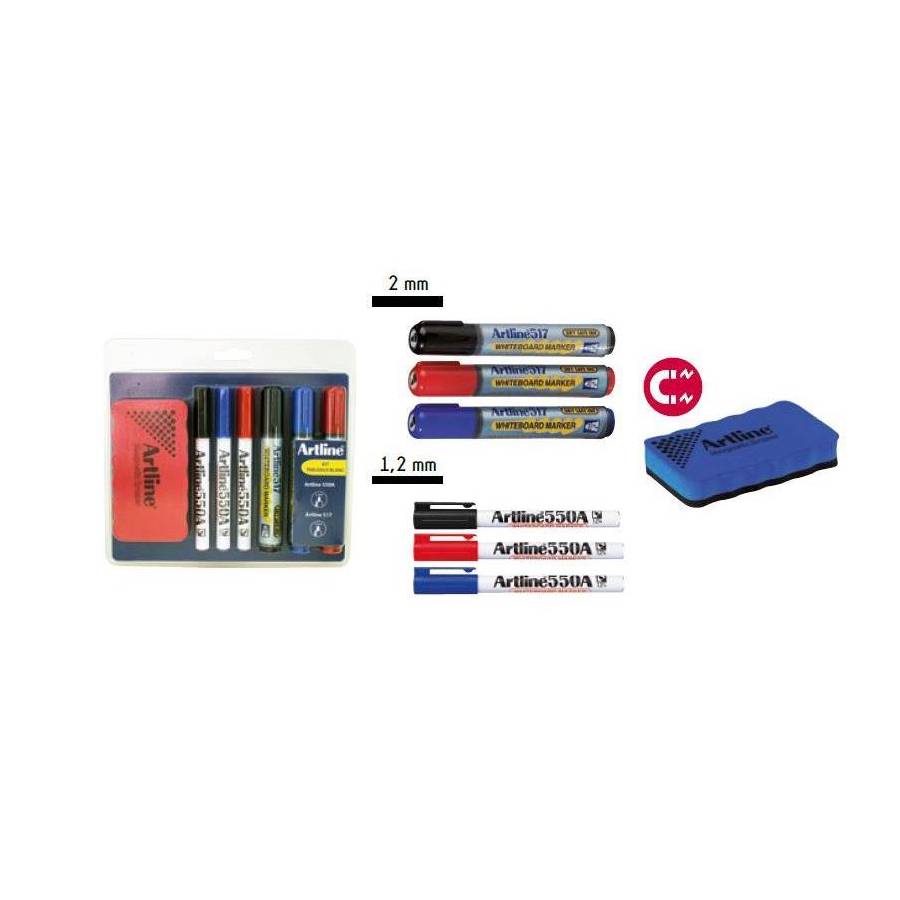 Kit pour tableau blanc : 1 brosse magnétique + 6 marqueurs 3 assortis