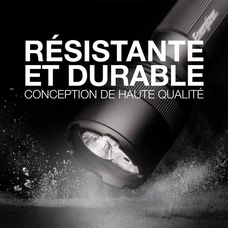 3CONTIENT : La lampe Energizer Tactical LED est fournie avec 6 piles AA ULTRA LUMINEUSE : Portée jusqu'à 200 mètres grâce à une luminosité pouvant atteindre 1 000 lumens (en mode Haute intensité) SOLIDE : Construction en aluminium de qualité aéronautique et technologie qui permet à la lampe d'être immergée à 1 mètre de profondeur pendant 30 minutes tout en restant étanche POLYVALENTE : Choix entre 3 modes d'éclairage : Haute intensité, Basse intensité et Lumière stroboscopique de sécurité