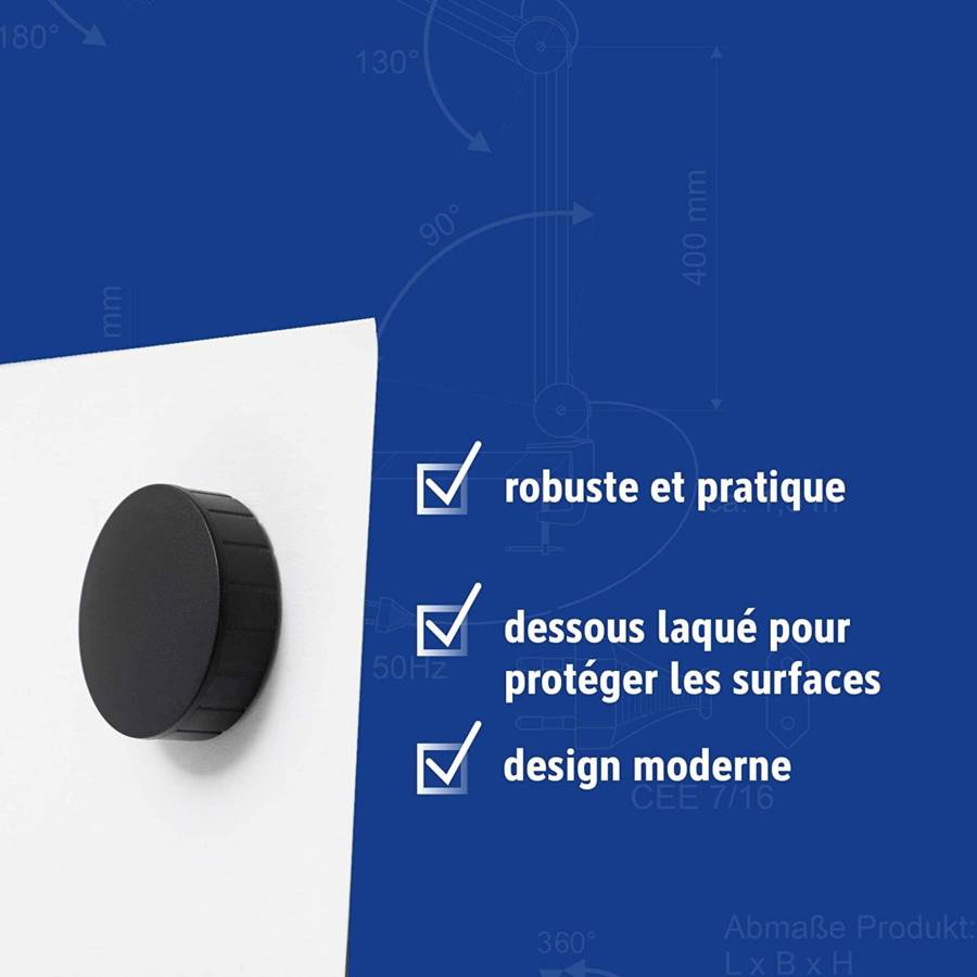 Stable & Robuste – L'aimant puissant MAULsolid est particulièrement robuste malgré sa taille : il peut supporter une charge jusqu'à 1,5 kg. Il peut également être agrippé facilement Surface vernie – Chaque aimant tableau est verni avec un liquide spécial afin de protéger la surface magnétique et d'optimiser son utilisation Design moderne – Ces grands aimants puissants ont une coque légèrement arrondie et une petite bordure pour faciliter la prise en main : ils sont à la fois élégants et pratiques