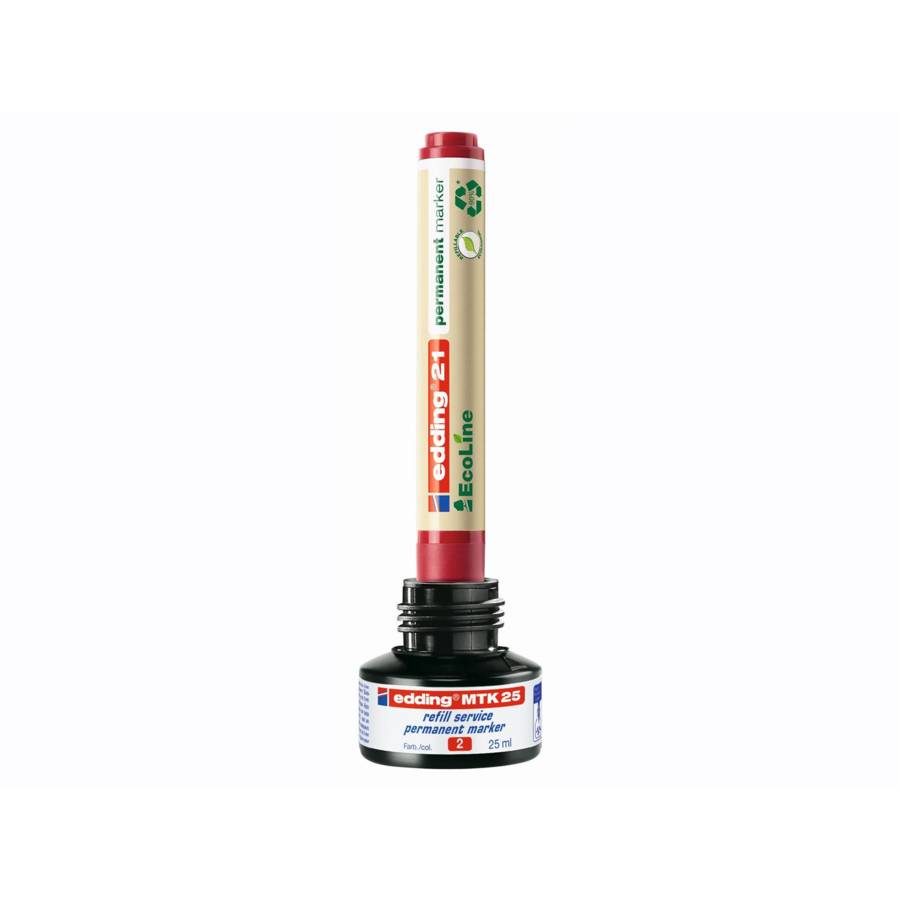 rechargeables dans les couleurs noir, rouge, bleu et vert avec les encres de recharge edding MTK 25, edding T 25, edding T 100 et edding T 1000