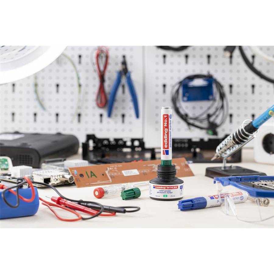 Il est rechargeable dans les coloris noir, rouge, bleu et vert avec les recharges edding MTK 25, edding T 25, edding T 100 et edding T 1000