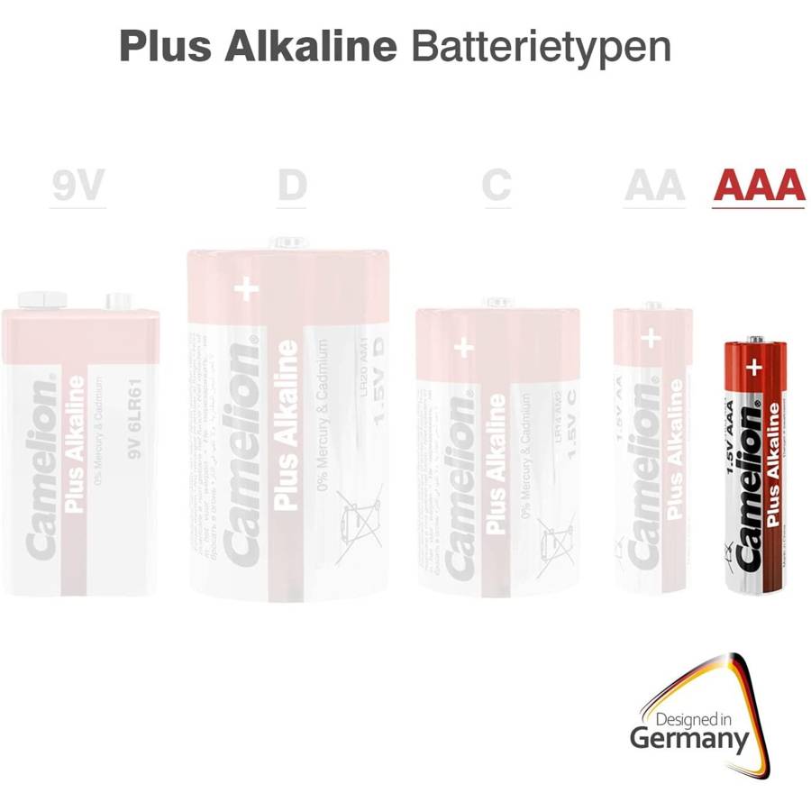 Alcaline LR03 / LR3 – AAA Dimensions pile : Ø10.0 x 44.0 mm / Poids 11.8g Capacité : 1250mAh à 0.8V (à 25mA Charge en continu) / Tension 1.5V Les piles Camelion Plus Alcaline possèdent le rendement maximum qu'une pile alcaline puisse avoir. Avec leurs longues durées de vie et leurs différents conditionnements, elles sont idéales pour la majorité des appareils électroniques.