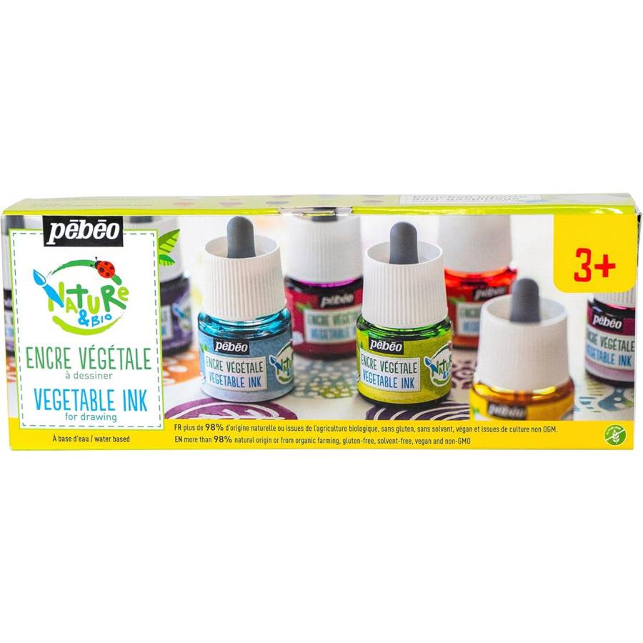 ENCRE VEGETALE 5X45ML ASSORTIS COULEURS PRIMAIRES Encre concentrée à base de pigments végétaux Couleurs vives, transparentes et mélangeables Facile à nettoyer à l'eau Provient à plus de 98 % d'origine naturelle ou biologique. Le lot de couleurs primaires contient les 5 couleurs suivantes, en flacons de 45 ml : blanc, noir, bleu, rouge, jaune