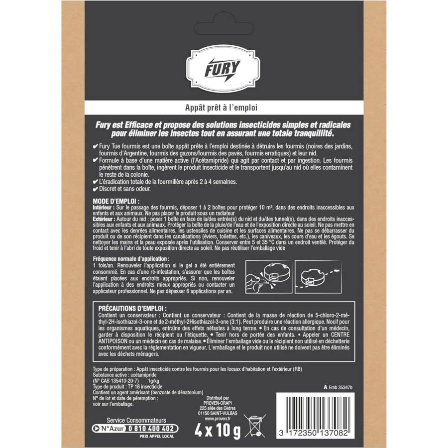 boîte x 4 Fury boite appât fourmis Dites adieu aux fourmilières avec notre produit puissant. Agissant par contact et par ingestion, il assure une élimination rapide et complète des fourmis. Notre formule garantit la destruction des nids en moins de deux semaines, assurant une tranquillité durable. Sans odeur, notre solution offre un confort optimal dans votre environnement. Utiliser les produits biocides avec précaution. Avant toute utilisation, lisez l'étiquette et les informations sur le produit
