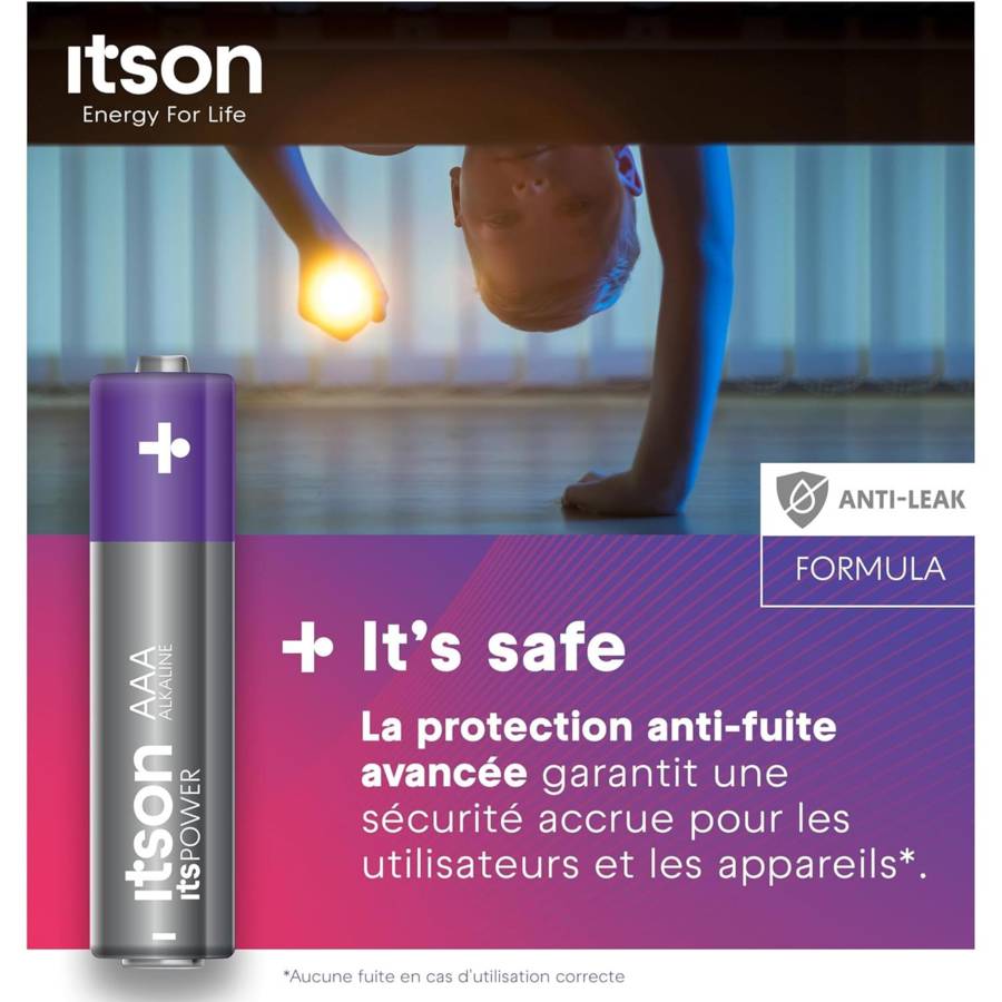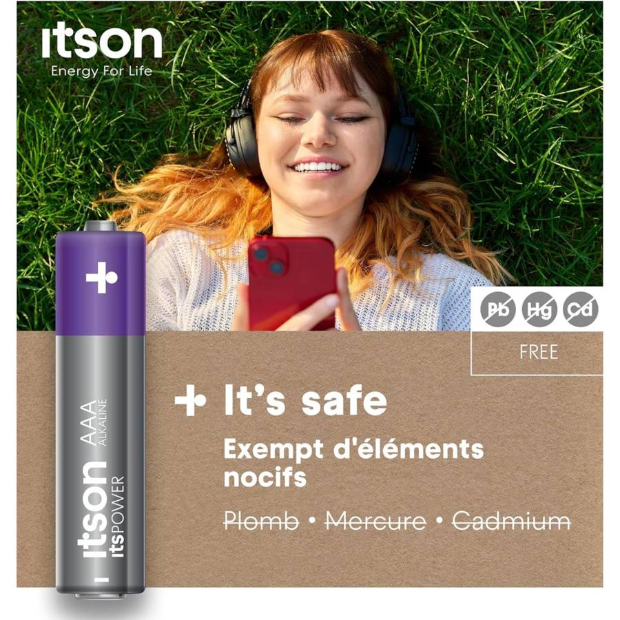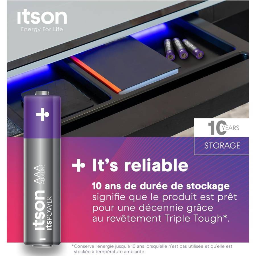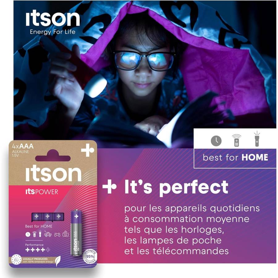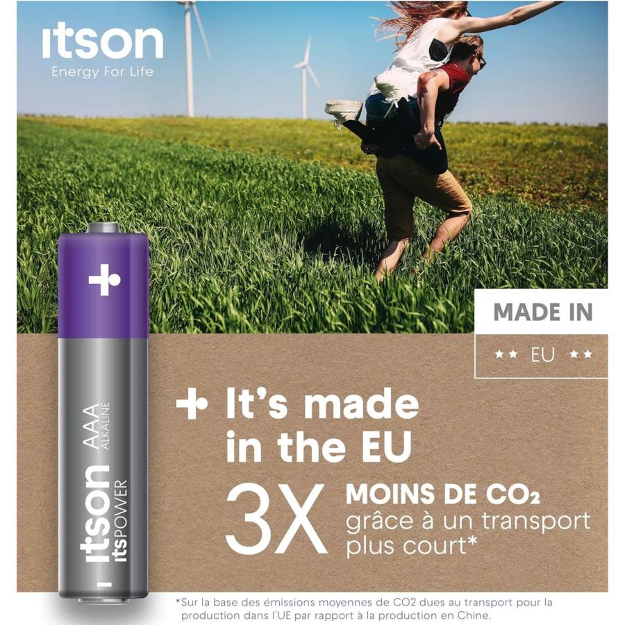 Voir plusLa batterie itsPOWER est un choix optimal pour la plupart des appareils ménagers à consommation faible ou moyenne, tels que les télécommandes ou les horloges. Vous et vos appareils restez en sécurité grâce à la protection anti-fuite itson qui empêche l'accumulation de gaz généralement causée par une décharge ou un stockage excessif [1]. Grâce à une conception de haute qualité, itsPOWER peut être conservé pendant au moins 10 ans [2]. Un alliage spécial de fer et de nickel recouvre les deux pôles de la cellule, ce que nous appelons la solution unique Triple Tough Coating. Cela préserve la durée de vie et l'énergie de la batterie - une utilisation plus longue de la batterie, moins de déchets. Une production européenne à 100 % permet de diviser par trois les émissions de CO2 [3]. En outre, les batteries sont produites à partir d'une énergie 100 % renouvelable afin de contribuer à un changement positif pour l'avenir [4]. Les piles sont livrées dans un emballage en papier 100 % sans plastique, composé d'au moins 95 % de matériaux recyclés et certifié FSC. Vous pouvez librement recycler l'emballage en papier, mais également les piles elles-mêmes [5]. [1] Pas de fuite si la batterie est utilisée correctement. [2] Conserve l'énergie jusqu'à 10 ans lorsqu'elle n'est pas utilisée et qu'elle est stockée à température ambiante. [3] Sur la base des émissions moyennes de CO2 dues au transport pour la production dans l'UE par rapport à la production en Chine. [4] L'électricité utilisée provient de sources renouvelables garanties. [5] Pour recycler les piles, apportez vos piles usagées à l'un des points de collecte désignés dans votre région, où elles seront collectées par une entreprise spécialisée. Le processus de recyclage des piles alcalines permet d'extraire, entre autres, du fer à usage multiple, du zinc pour les toits ou les fenêtres, des matériaux pour la construction des routes et des cimenteries
