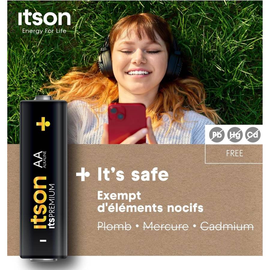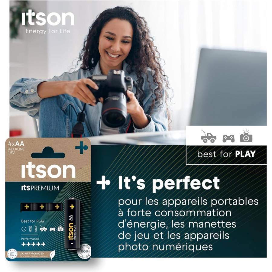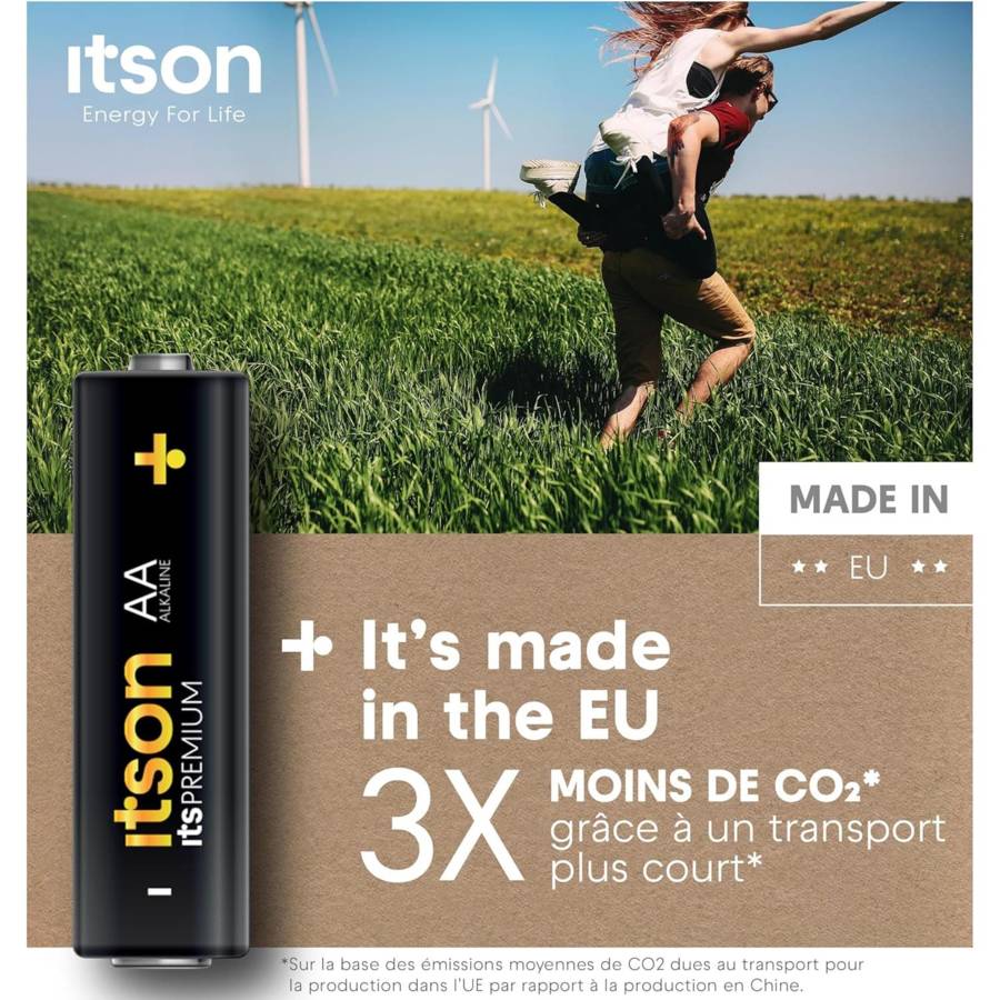 Voir plusLa batterie AA itsPREMIUM est un choix fiable pour les appareils à forte consommation, tels que les appareils photo numériques, les manettes de jeu, les jouets ou même les drones. Vous et vos appareils restez en sécurité grâce à la protection anti-fuite avancée itson qui empêche l'accumulation de gaz généralement causée par une décharge ou un stockage excessif [1]. Grâce à une conception de haute qualité, itsPREMIUM peut être conservé pendant au moins 10 ans, ce qui vous permet d'en avoir toujours à portée de main [2]. Un alliage spécial de fer et de nickel recouvre les deux pôles de la cellule, ce que nous appelons la solution unique Triple Tough Coating. Cela préserve la durée de vie et l'énergie de la batterie - une utilisation plus longue de la batterie, moins de déchets. En produisant des piles alcalines itsPREMIUM à 100 % sur le territoire de l'UE, nous avons réduit les émissions de CO2 trois fois [3]. En outre, les batteries sont produites à partir d'une énergie 100 % renouvelable afin de contribuer à un changement positif pour l'avenir [4]. Vous pouvez librement recycler l'emballage en papier, mais également les piles elles-mêmes [5]. Devenez un pro !\n\n[1] Pas de fuite si la batterie est utilisée correctement.\n[2] Sur la base des émissions moyennes de CO2 dues au transport pour la production dans l'UE par rapport à la production en Chine.\n[3] Conserve l'énergie jusqu'à 10 ans lorsqu'elle n'est pas utilisée et qu'elle est stockée à température ambiante.\n[4] Pour recycler les piles, apportez vos piles usagées à l'un des points de collecte désignés dans votre région, où elles seront collectées par une entreprise spécialisée. Le processus de recyclage des piles alcalines permet d'extraire, entre autres, du fer à usage multiple, du zinc pour les toits ou les fenêtres, des matériaux pour la construction des routes et des cimenteries