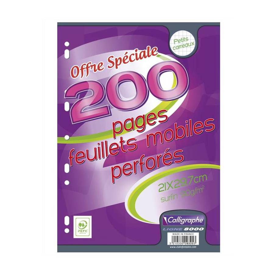 Paquet 100 Feuillets Mobile 21x29,7 cm 200 pages Perforées Petits Carreaux 90g