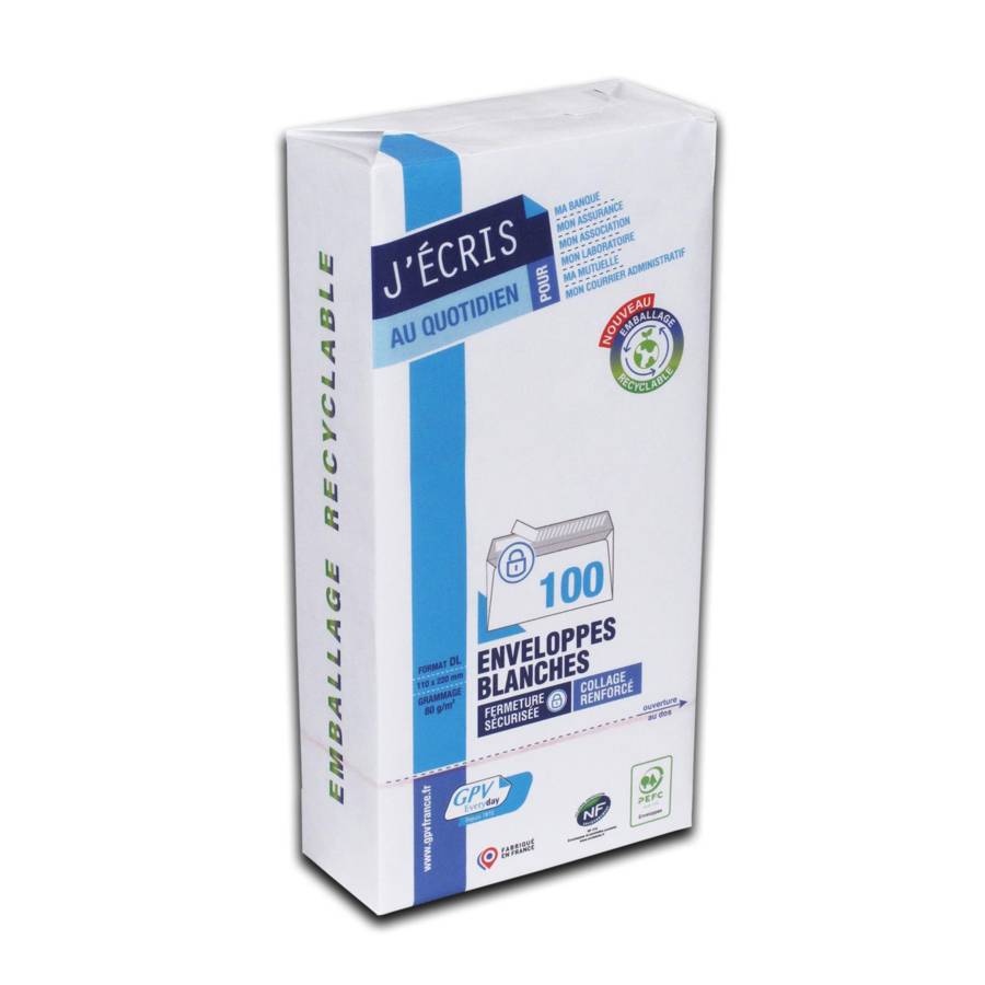 Fermeture sécurisée avec collage renforcé Papier 80 g/m² issu de forêts gérées durablement et fabrication carbone neutre Emballage papier recyclable GPV Everyday®, la marque de votre quotidien. Un large choix d'enveloppes et de pochettes labelisées, de grammages et conditionnements pour répondre à tous les besoins des particuliers, des entreprises et des organismes publics.