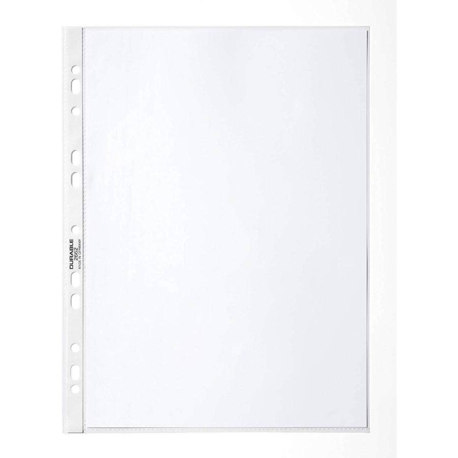 DURABLE Pochettes perforées, A4, PP, 0,06 mm, transparentes Pour le stockage pratique de documents non perforés dans des dossiers et des classeurs à anneaux Perforation universelle avec bande perforée renforcée, Qualité cristal pour une visibilité optimale des documents Traitées anti-transfert d'encre Ouverture par le haut Epaisseur : 48μ Contenu: 100 pièces